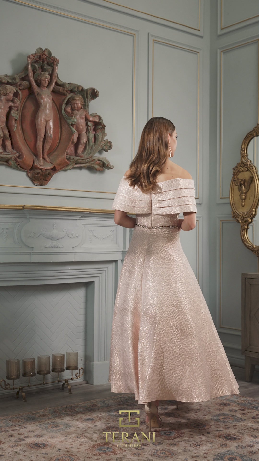 Alluring A-line tee-length dress in copper, rose gold, champagne, forest, and vino with cape-like sleeves. Features hook and eye closure and back zipper. Shop now!