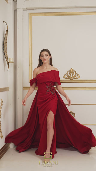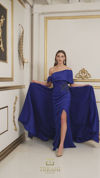 Divine asymetric off shoulder collar frames the intricate bead work on the hip with back train and cape like sleeves.