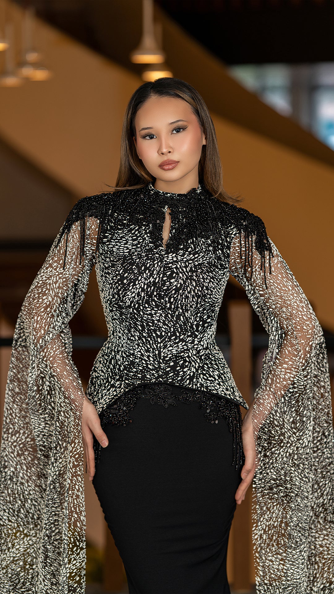 This dramatic gown features a fitted silhouette with a peplum-style bodice adorned in intricate beadwork. The design is elevated by flowing, sheer embellished sleeves that cascade to the floor, creating a regal and captivating effect. Perfect for formal galas or statement evening events.