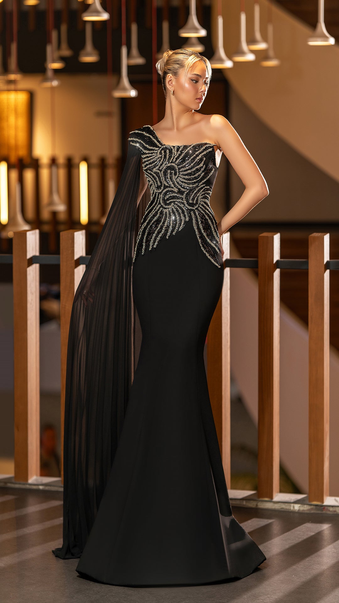 A stunning black evening gown featuring an asymmetrical one-shoulder design with a flowing cape sleeve. The fitted silhouette is enhanced by intricate metallic beadwork on the bodice, exuding elegance and modern glamour. Perfect for galas or red carpet events.