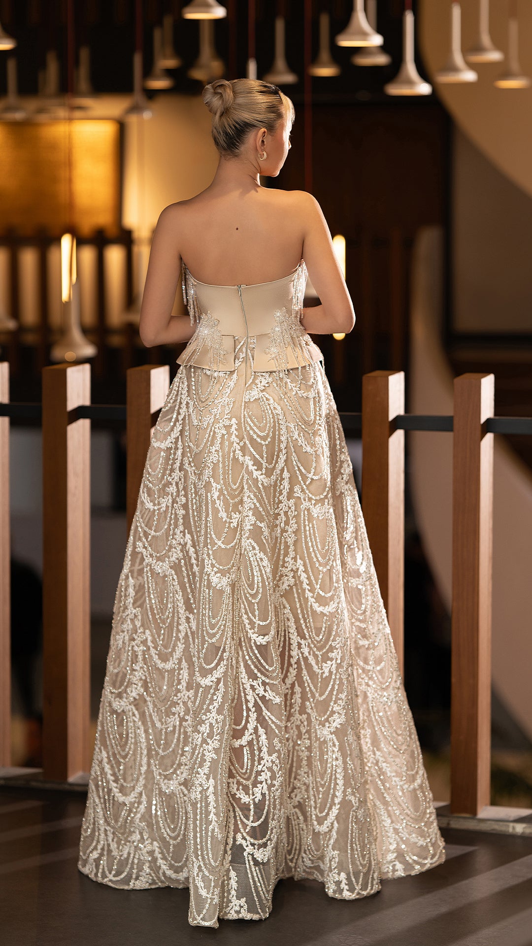 This exquisite champagne-colored gown features a strapless, corset-style bodice adorned with delicate lace and beaded embellishments. The voluminous A-line skirt showcases intricate embroidered patterns that cascade gracefully, adding a touch of timeless elegance. Perfect for weddings, galas, or formal evening events.