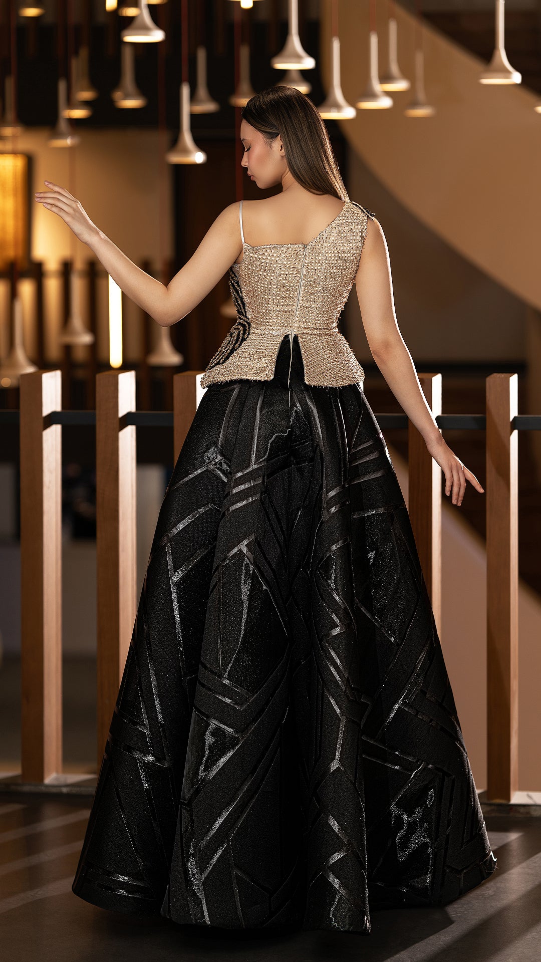 A glamorous black ball gown with a beaded, asymmetrical bodice featuring bold black and silver embellishments. The full skirt showcases a modern geometric pattern, blending classic elegance with contemporary flair.
