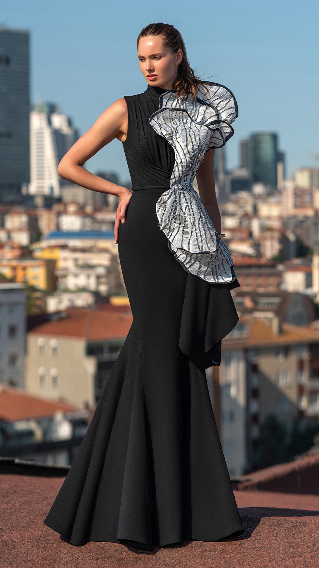 A sophisticated black mermaid gown featuring a striking sculptural silver embellishment that runs vertically across the front. The structured ruffle design adds architectural flair while maintaining an elegant silhouette.