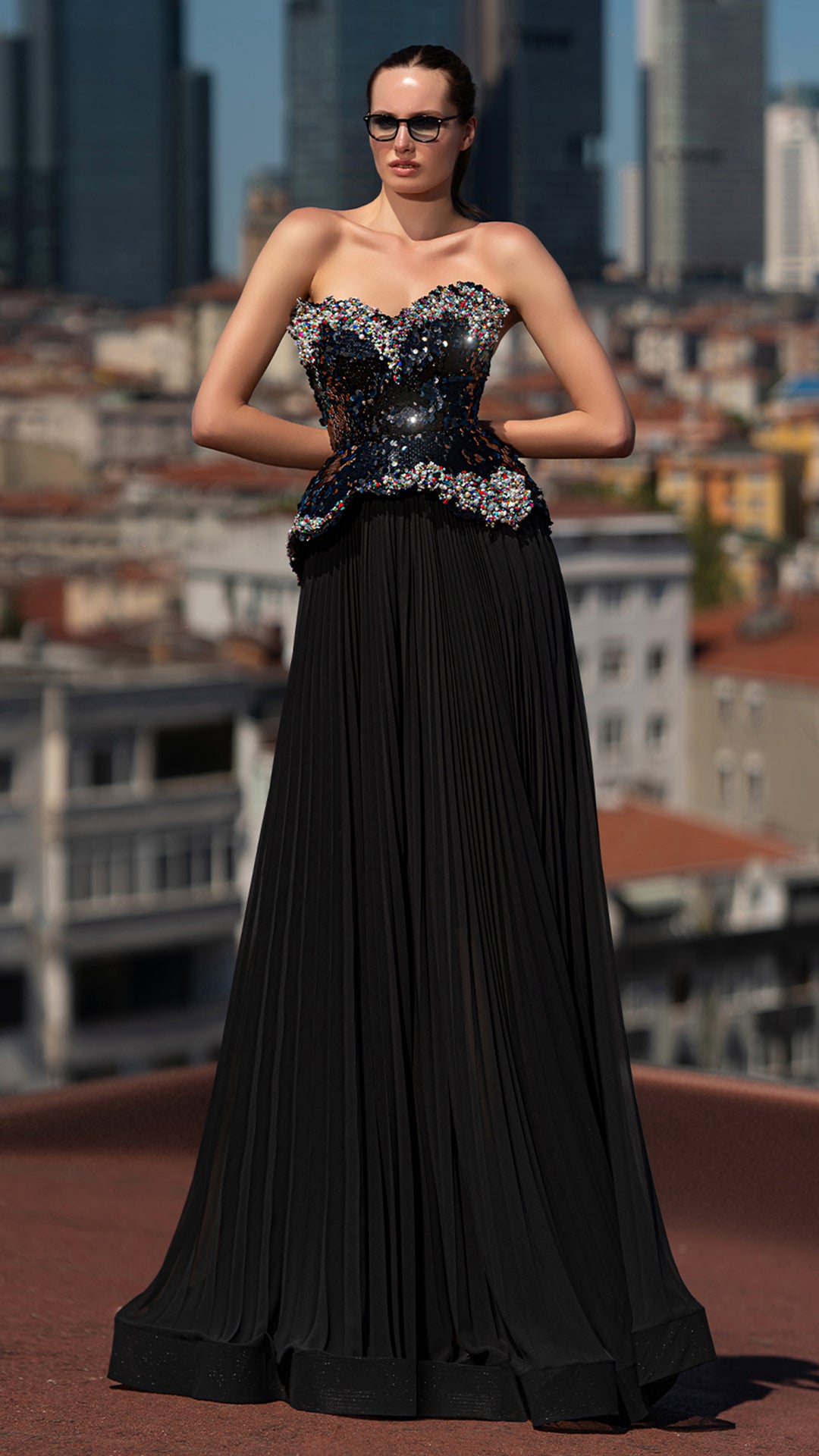 Strapless pleated gown with a shimmering beaded bodice and sleek, flowing skirt — a bold blend of glamour and sophistication.