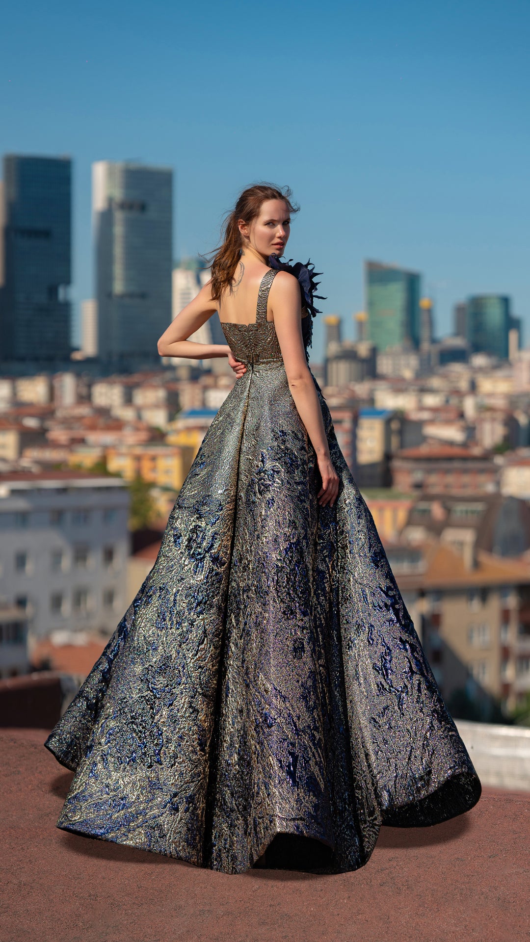 Another one-shoulder masterpiece with deep blue tones and metallic brocade fabric. The textural embroidery gives it a regal, almost celestial quality.