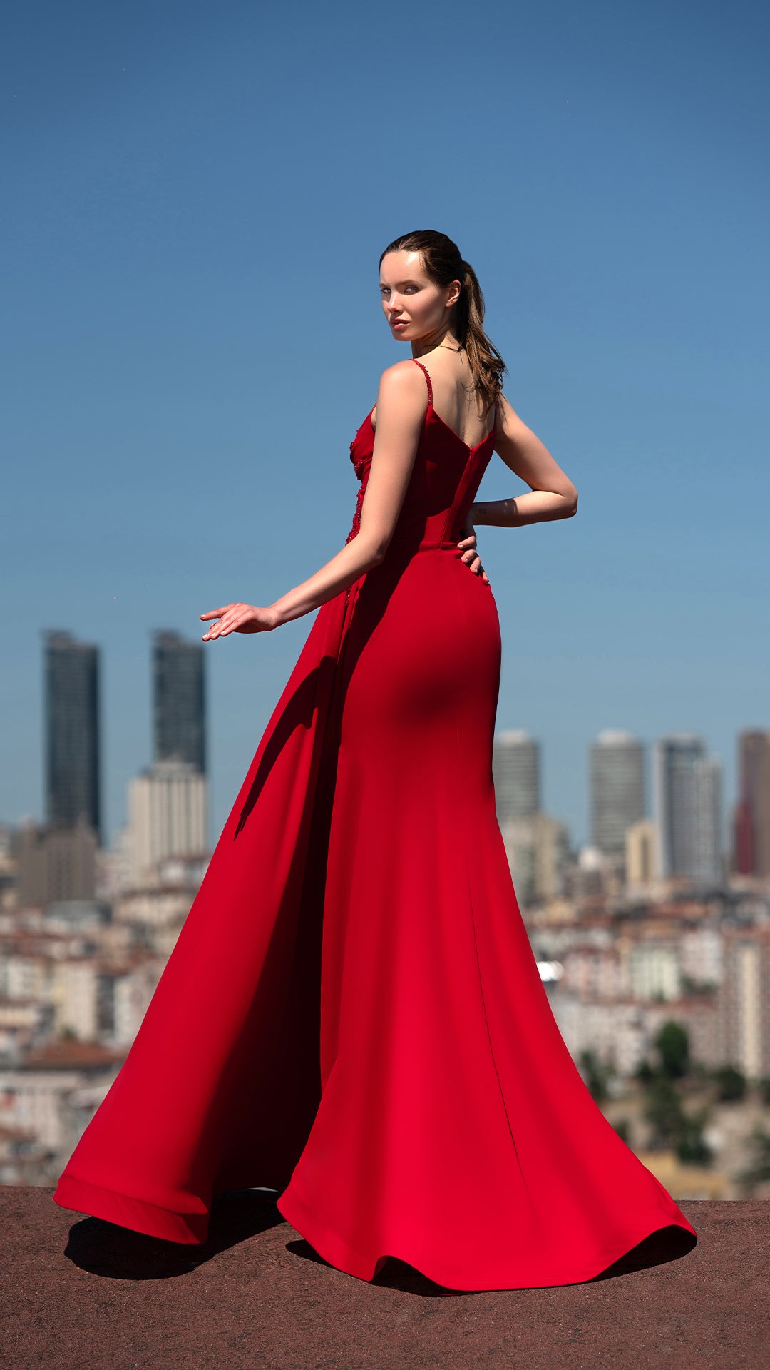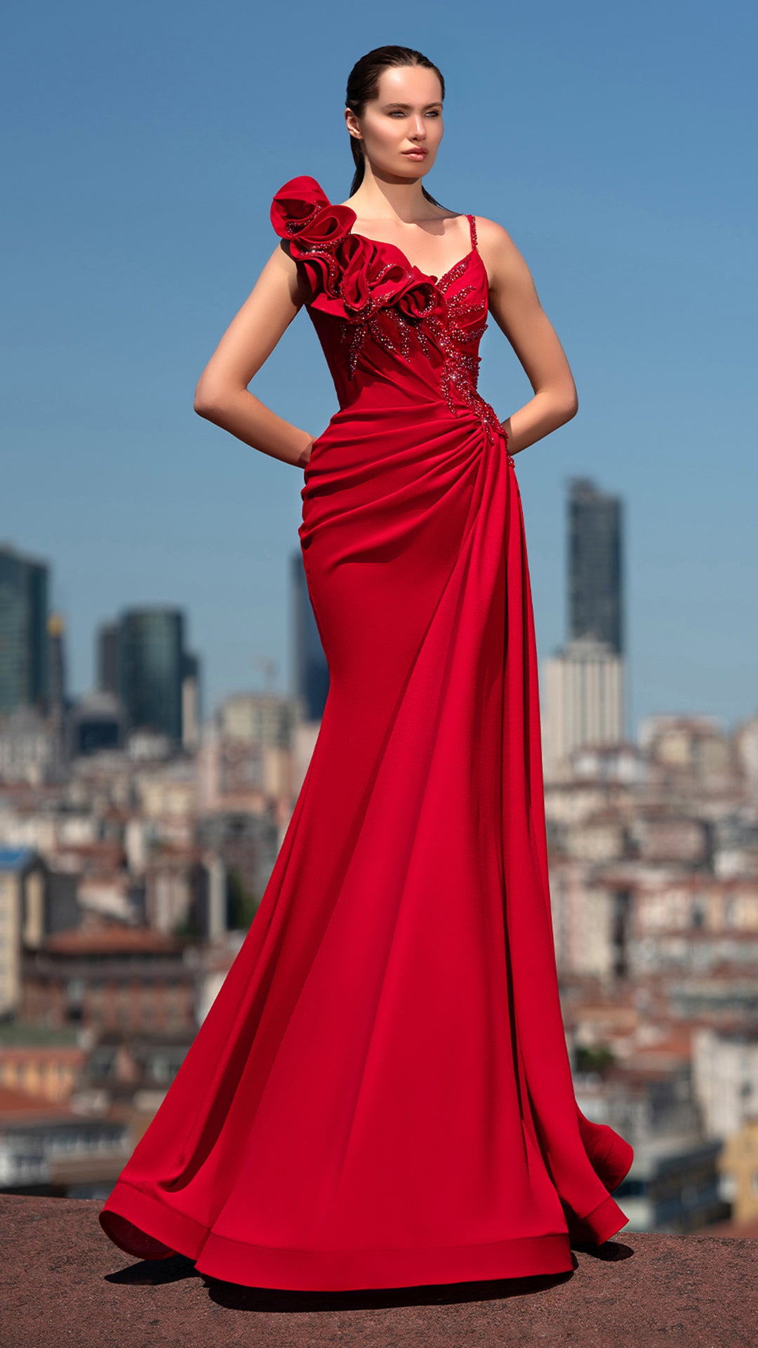 A bold, vibrant red gown with intricate floral ruffle detailing on one shoulder and a draped, form-fitting silhouette. The beadwork near the bodice gives it extra glamour, perfect for red-carpet occasions.