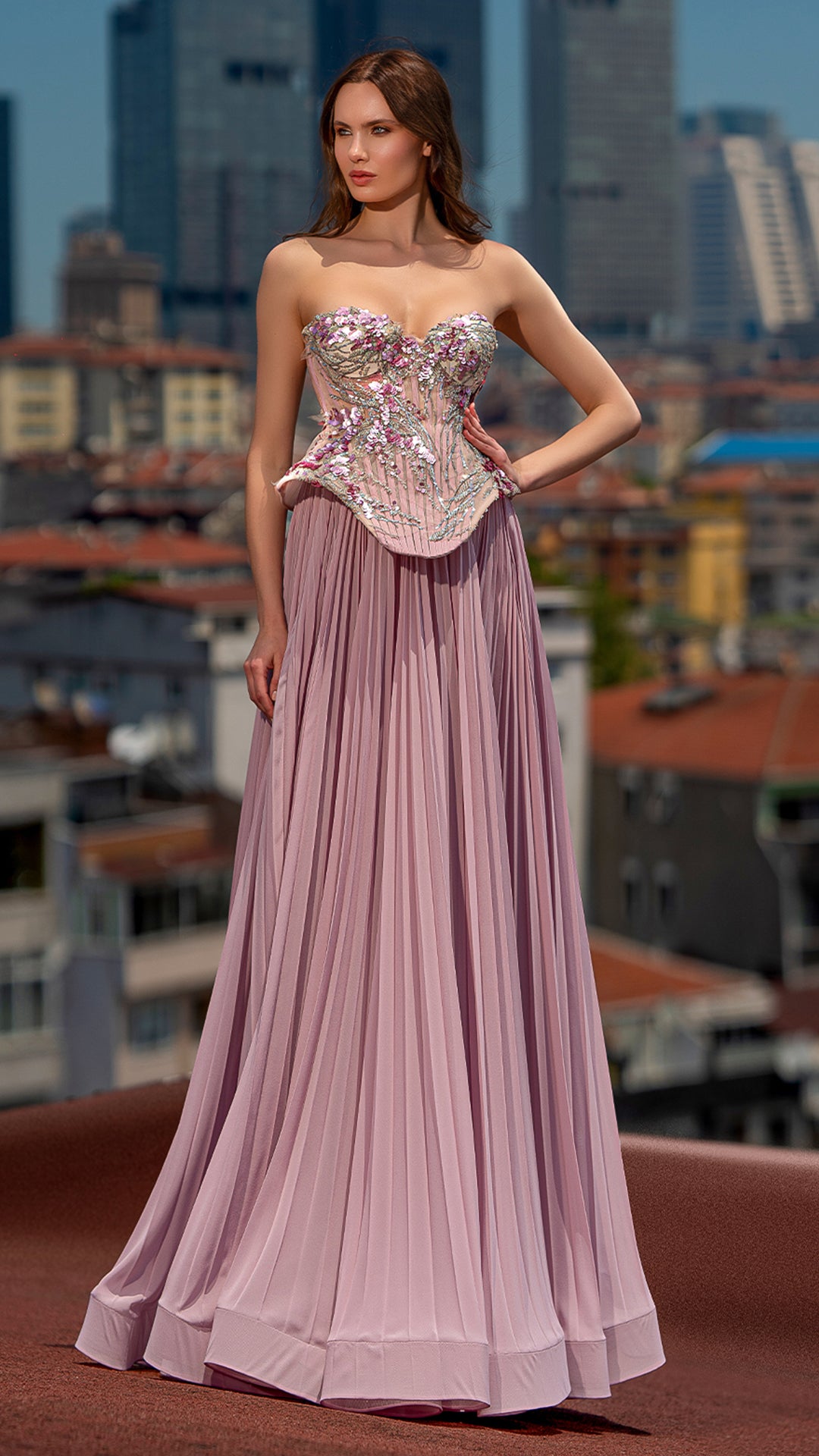 A dreamy blush pink gown featuring a strapless, floral-embroidered corset bodice and a soft pleated chiffon skirt. Romantic and graceful, it’s ideal for garden weddings or elegant soirées.