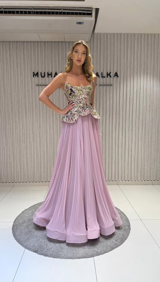 Style 6194 is a feminine and refined gown featuring a structured corset bodice with a soft sweetheart neckline and intricate embroidery throughout. The design flows into a full, layered skirt made of airy pleated fabric, creating a graceful silhouette that moves beautifully. The defined waist and delicate peplum detail add shape and sophistication, making this gown ideal for formal occasions or red-carpet events.