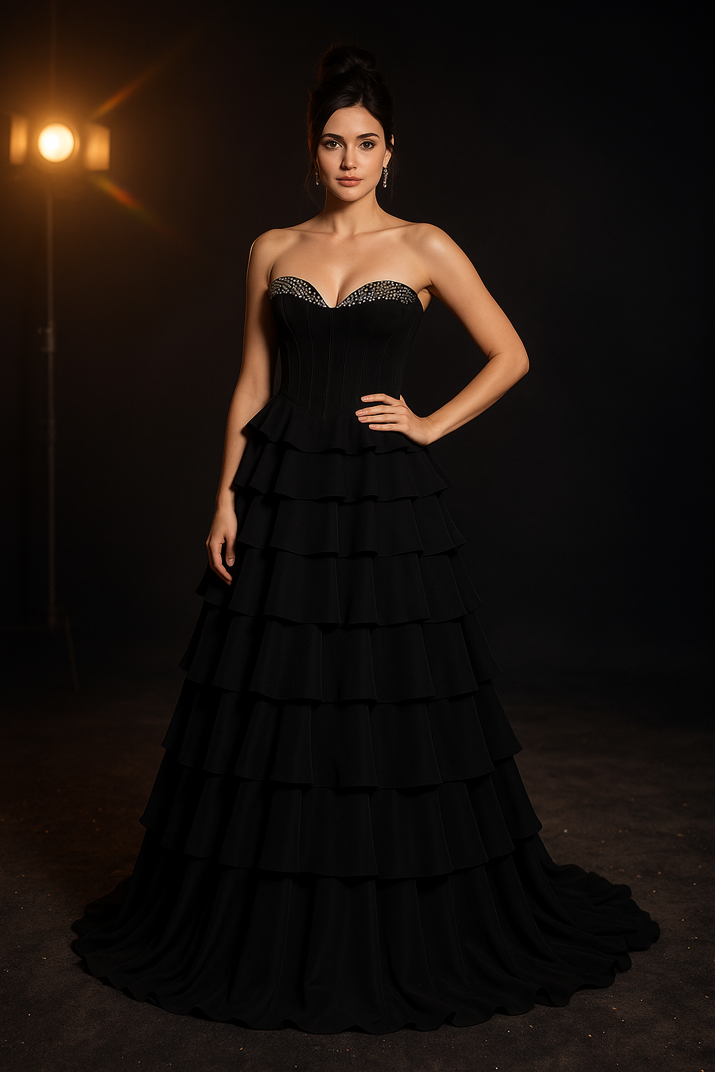 The BR238 gown features a structured strapless bodice with embellished cups that add a touch of sparkle and sophistication. The fitted waist flows into a dramatic tiered skirt of cascading ruffles, creating volume and movement. Crafted from layered chiffon, this gown offers a striking balance of glamour and elegance, ideal for formal evening occasions.