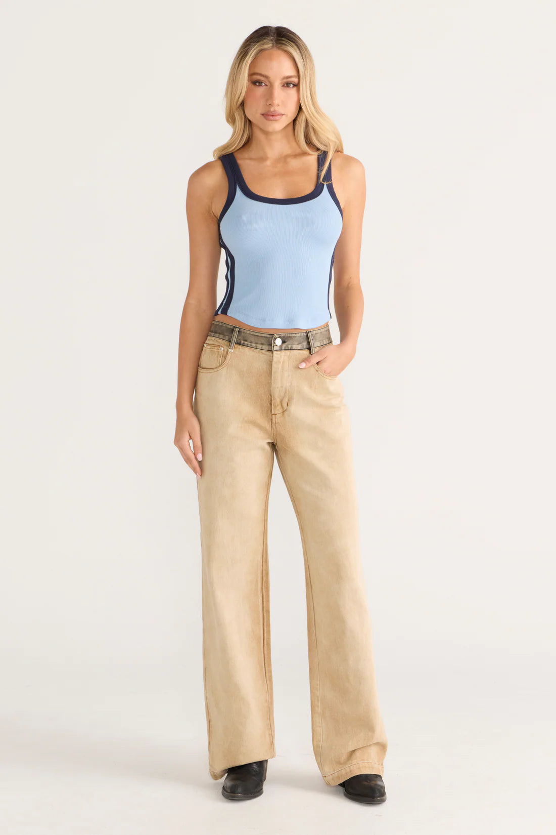 Cool girl energy, bottled. This scoop neck tank serves up early 2000s sport nostalgia with a modern twist. Featuring a figure-hugging fit and contour panelling, its finished with contrast navy binding for that graphic, off-duty vibe. Pair it with vintage denim or track pants and call it your new uniform.