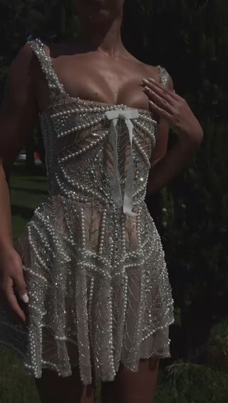 Playful yet polished, the Glimmer mini dress is your go-to for making a dazzling statement. Crafted with shimmering textured fabric, this flirty silhouette features a fitted bodice with delicate straps, a charming front bow detail, and a structured mini skirt that radiates movement and charm. The intricate metallic thread work catches the light from every angle, giving Glimmer its signature sparkle. Perfect for cocktail parties, date nights, or a bold entrance, this dress brings high-fashion flair with youthful elegance.