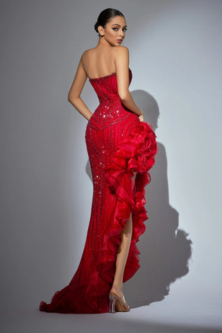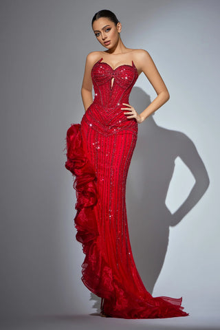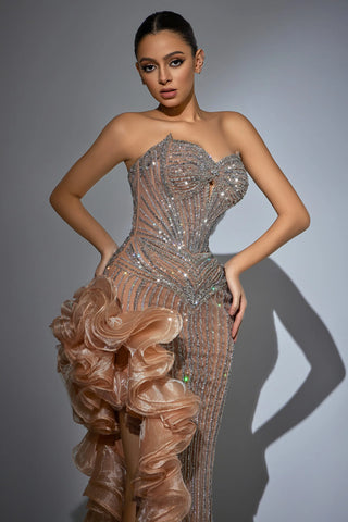 This luxurious evening gown is lavishly adorned with intricate hand-beaded embellishments that shimmer with every movement, showcasing exceptional craftsmanship and elegance. Designed to exude opulence and sophistication, it?? a true statement piece for any high-end occasion.