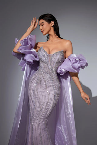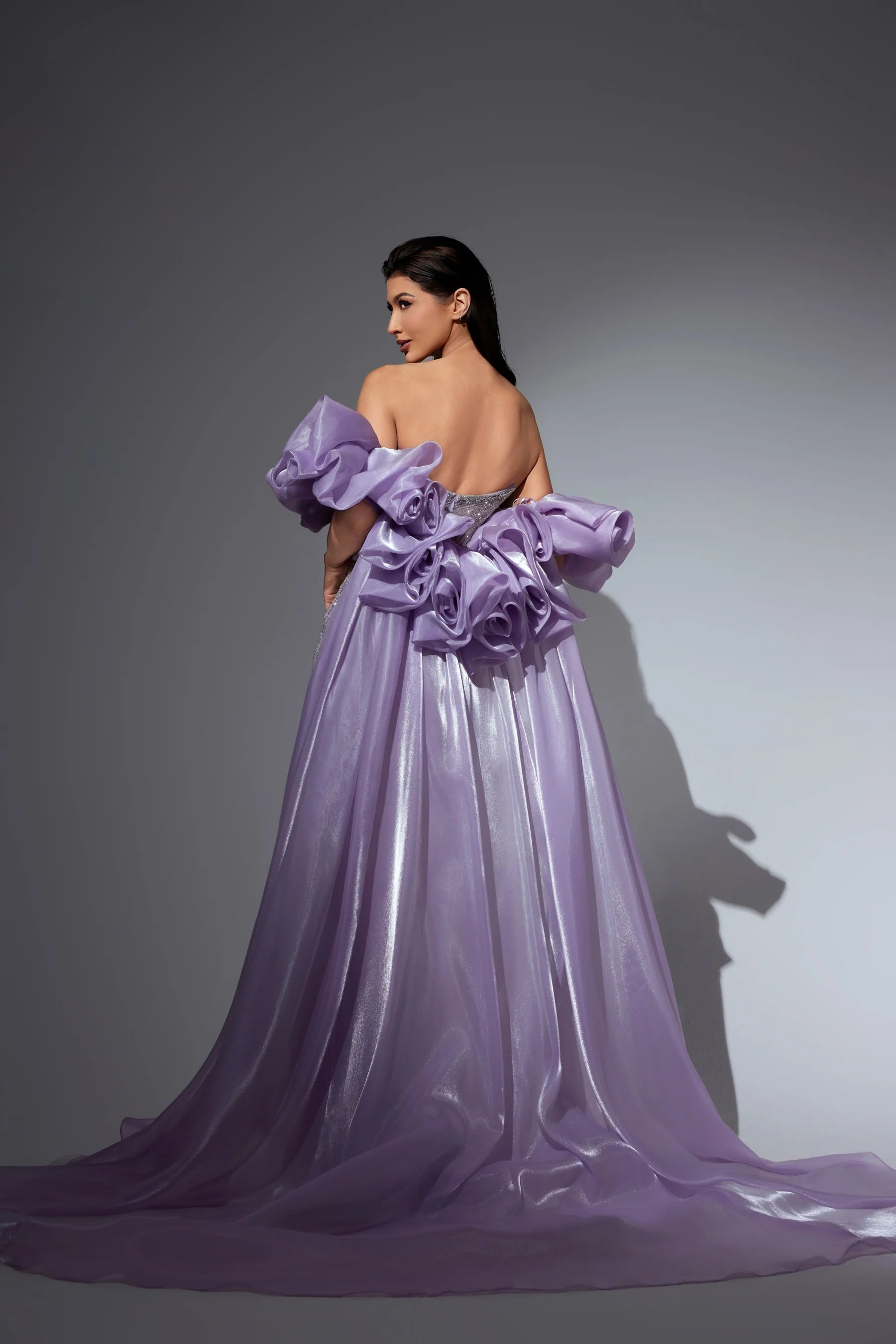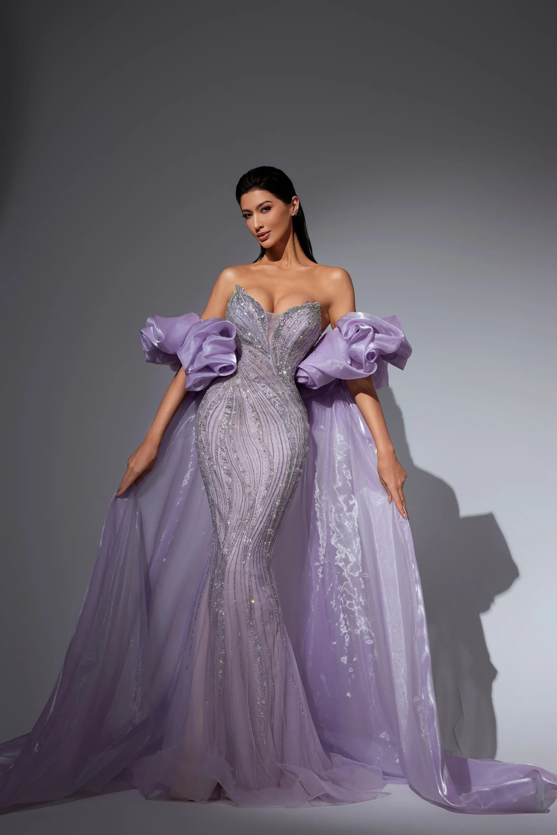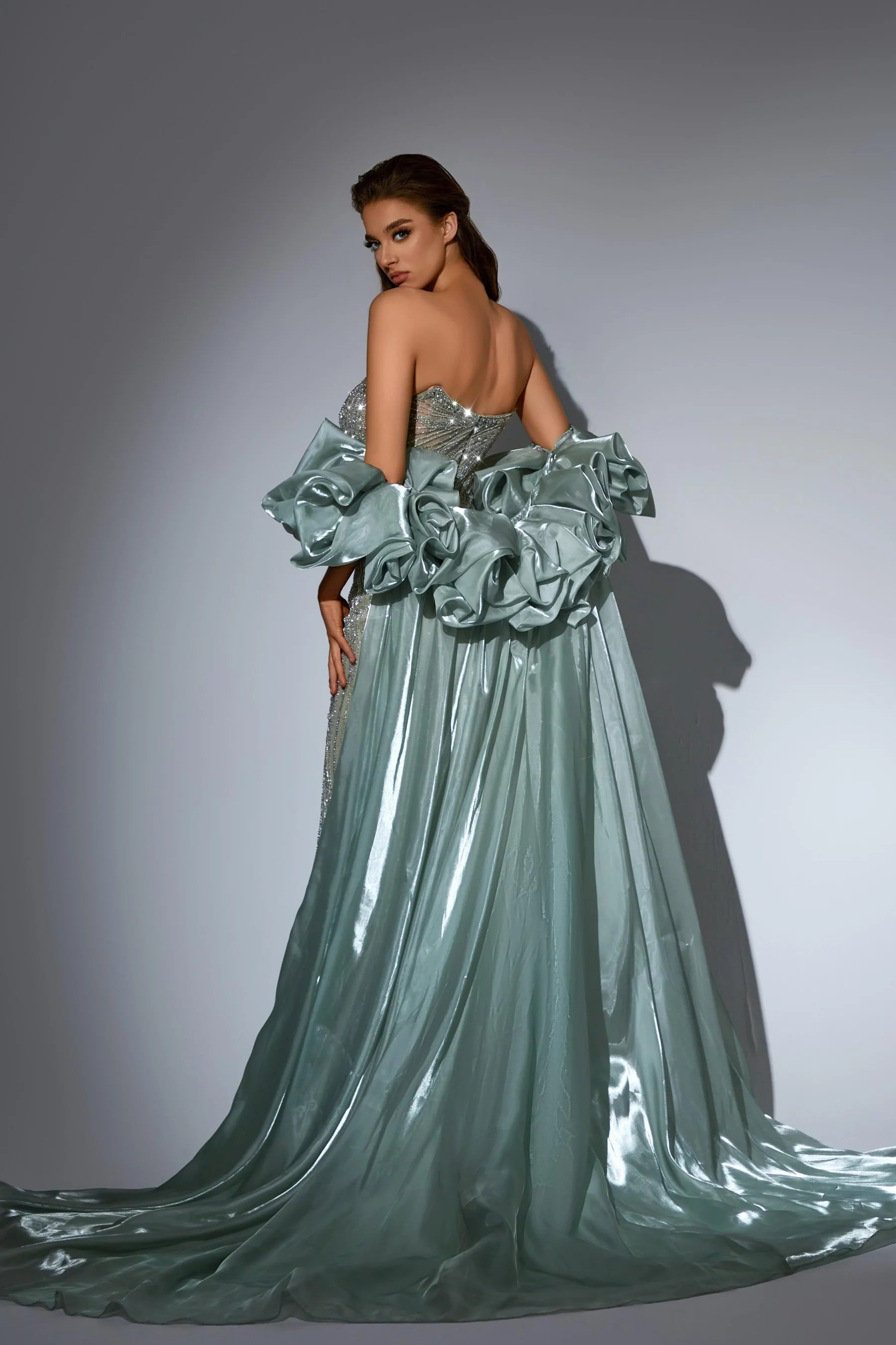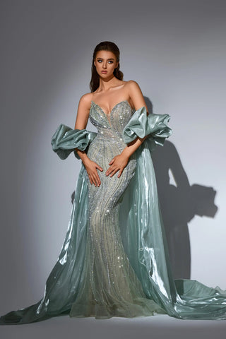 This luxurious evening gown is lavishly adorned with intricate hand-beaded embellishments that shimmer with every movement, showcasing exceptional craftsmanship and elegance. Designed to exude opulence and sophistication, it?? a true statement piece for any high-end occasion.