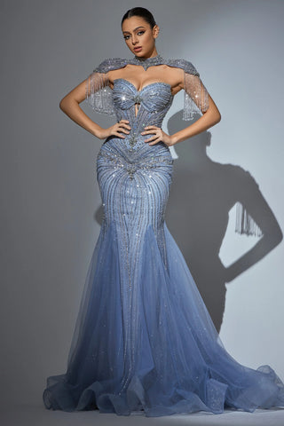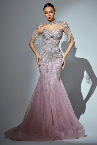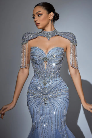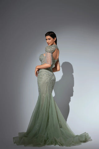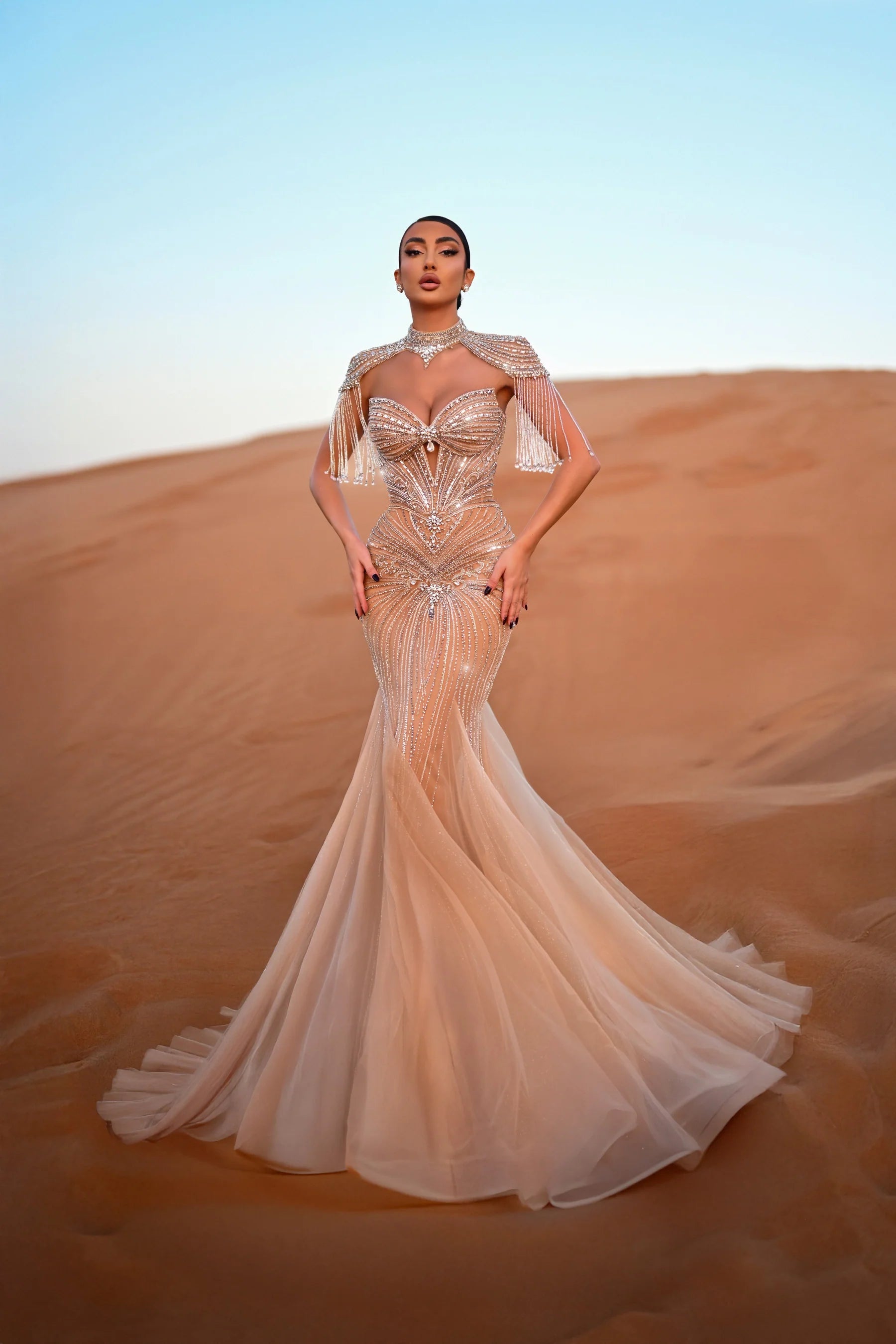 This luxurious evening gown is lavishly adorned with intricate hand-beaded embellishments that shimmer with every movement, showcasing exceptional craftsmanship and elegance. Designed to exude opulence and sophistication, it?? a true statement piece for any high-end occasion.