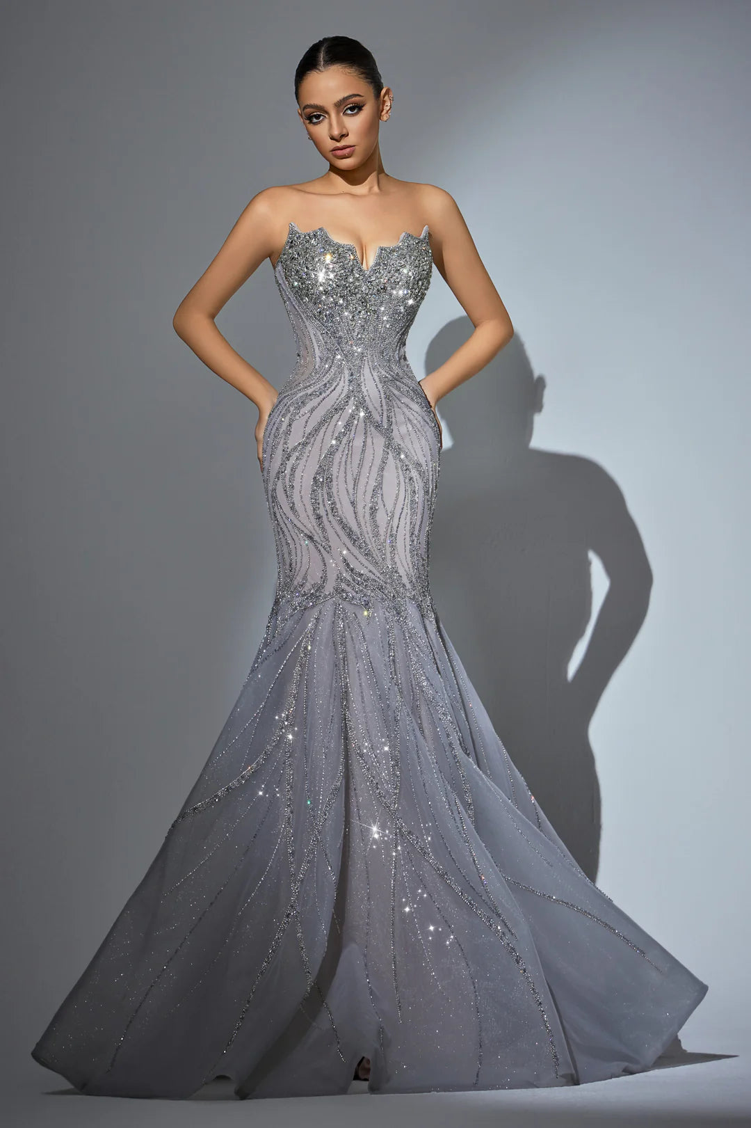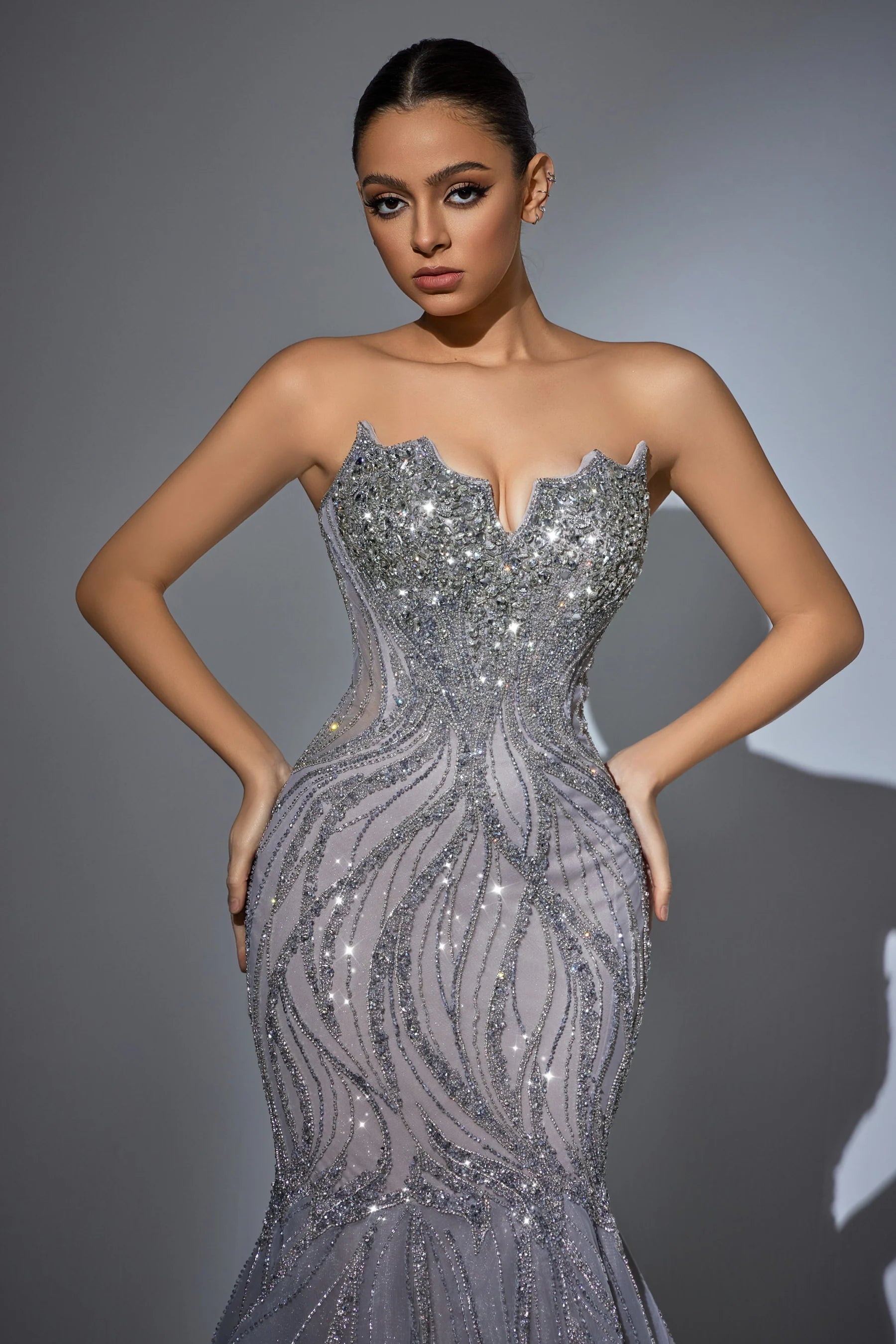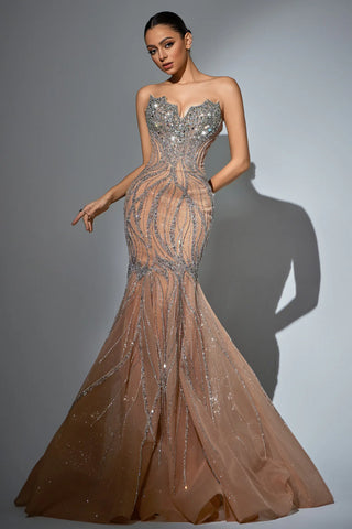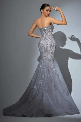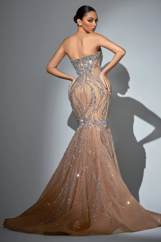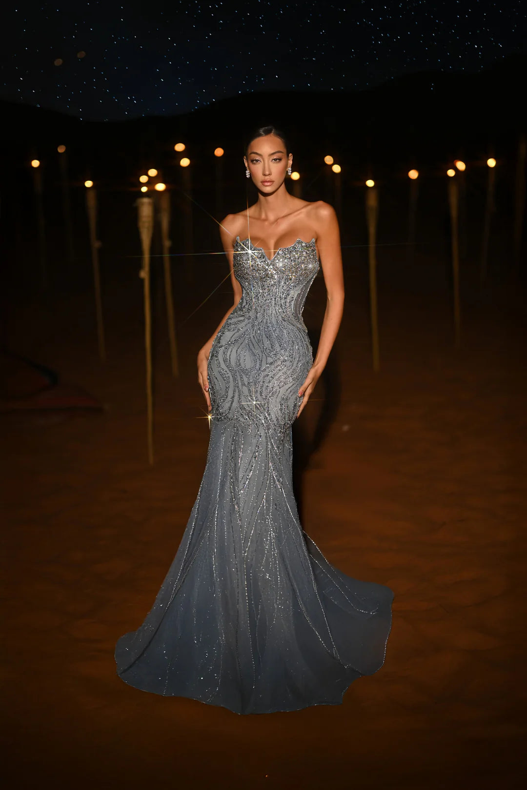 This luxurious evening gown is lavishly adorned with intricate hand-beaded embellishments that shimmer with every movement, showcasing exceptional craftsmanship and elegance. Designed to exude opulence and sophistication, it?? a true statement piece for any high-end occasion.