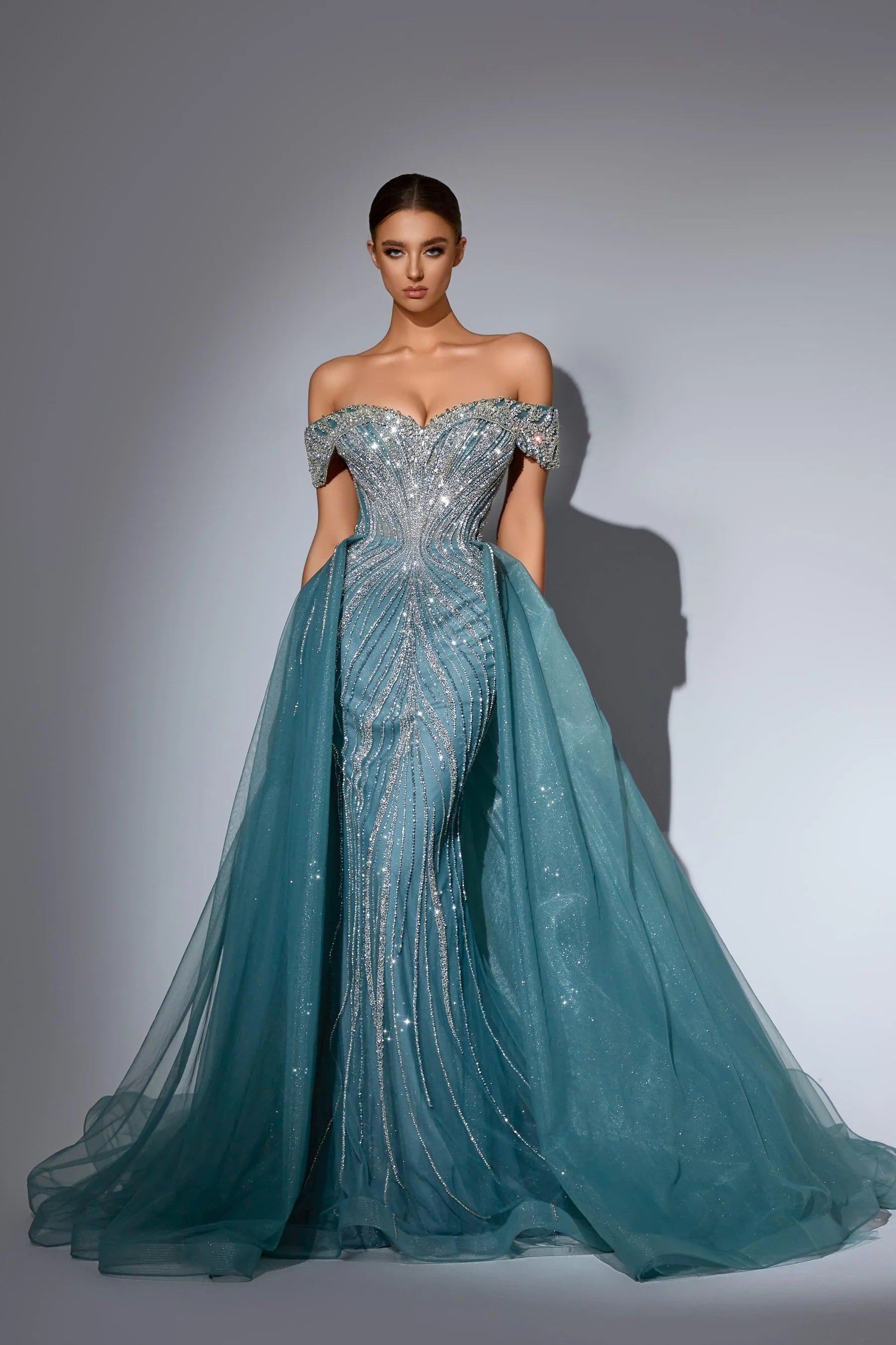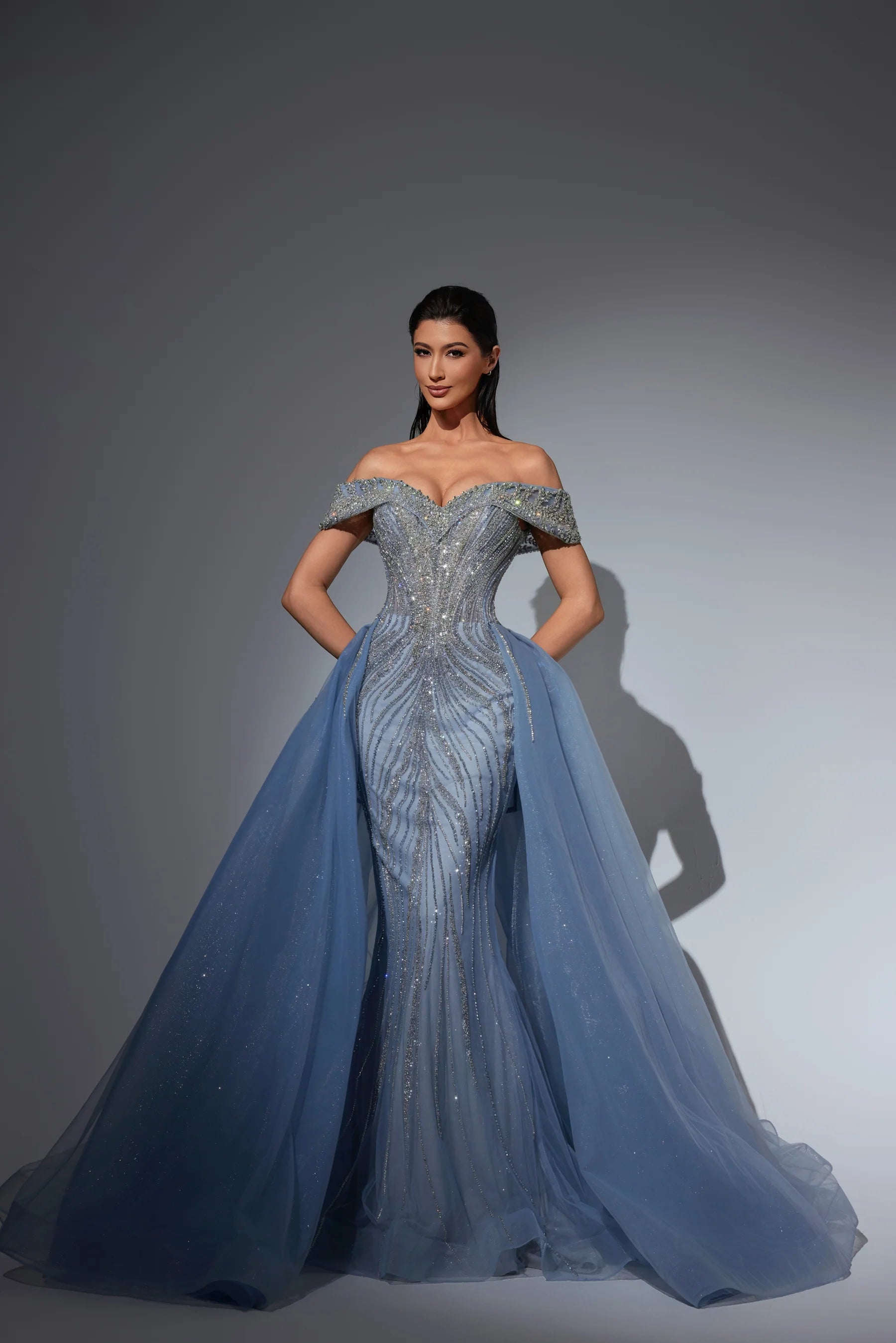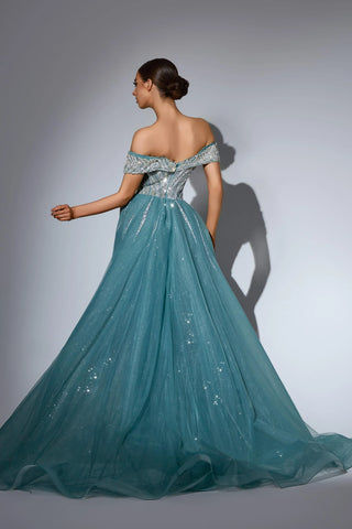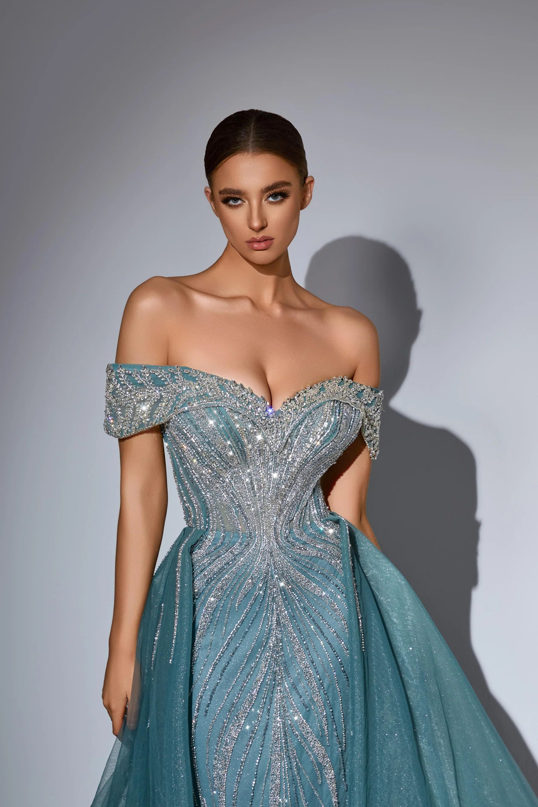 This luxurious evening gown is lavishly adorned with intricate hand-beaded embellishments that shimmer with every movement, showcasing exceptional craftsmanship and elegance. Designed to exude opulence and sophistication, it?? a true statement piece for any high-end occasion.