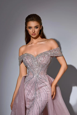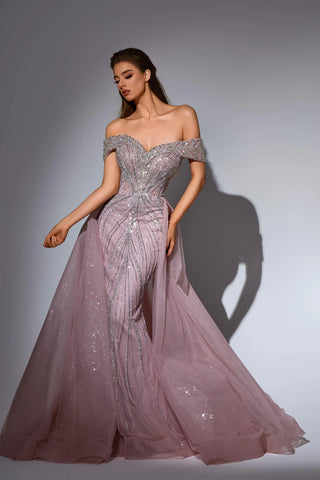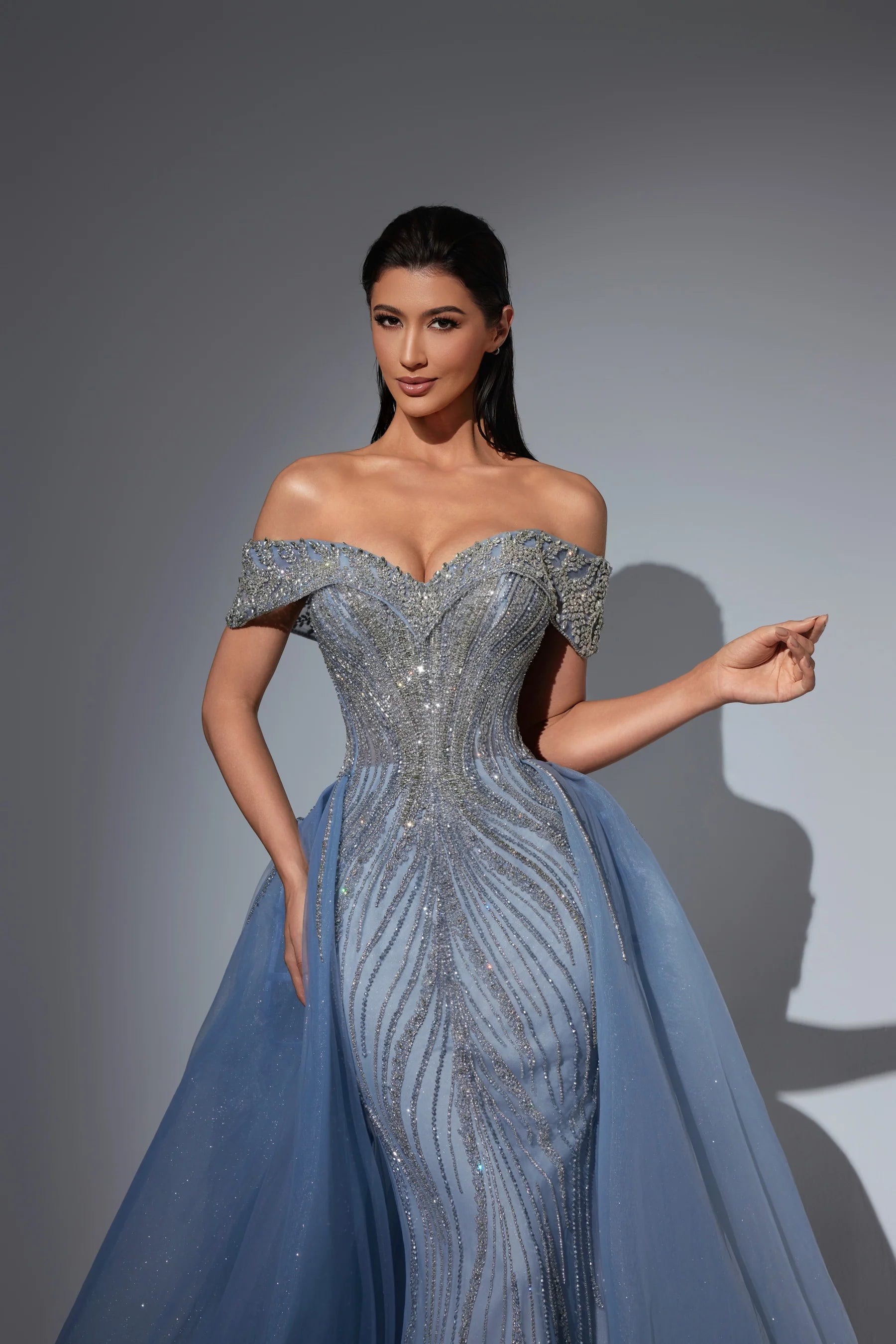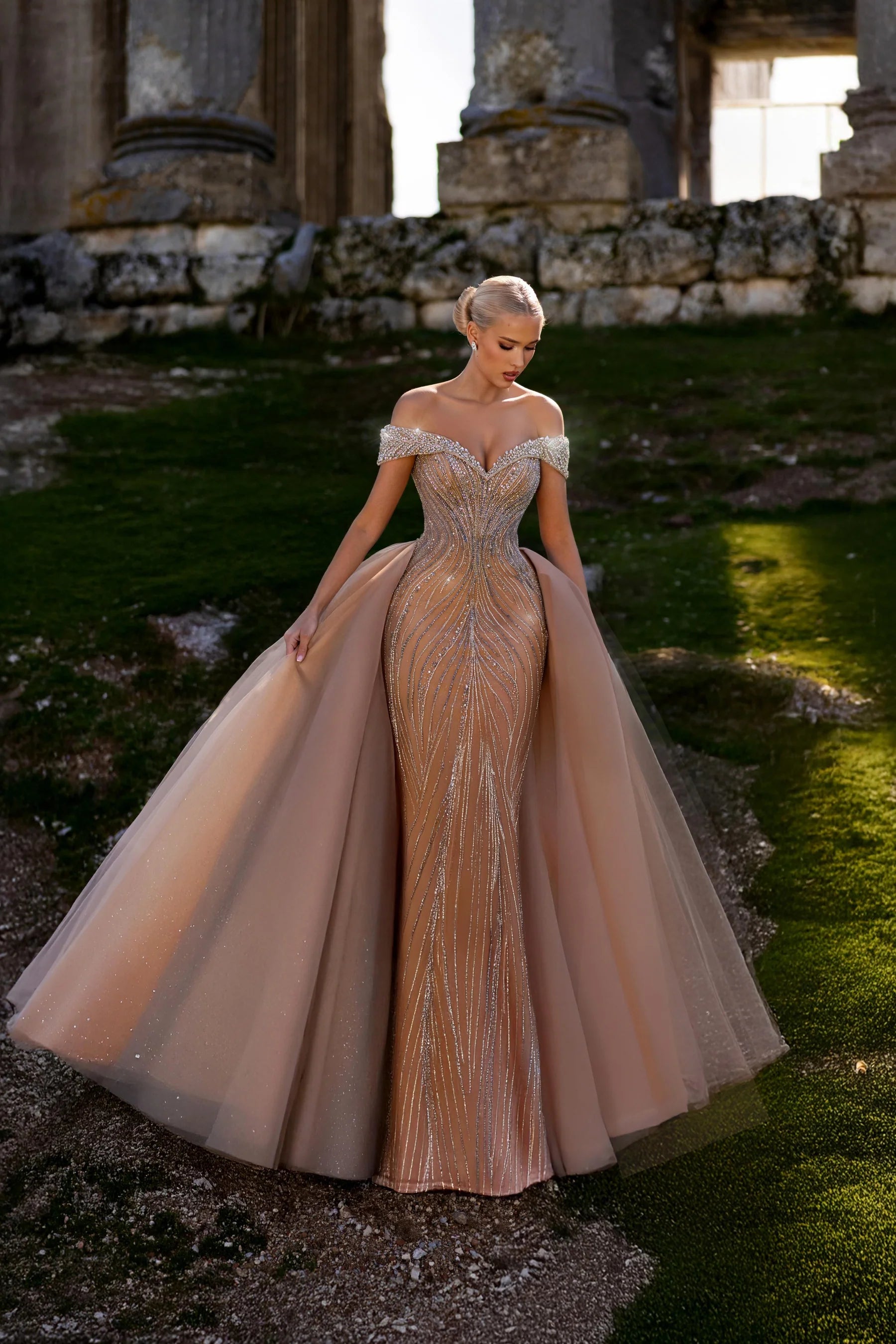 This luxurious evening gown is lavishly adorned with intricate hand-beaded embellishments that shimmer with every movement, showcasing exceptional craftsmanship and elegance. Designed to exude opulence and sophistication, it?? a true statement piece for any high-end occasion.