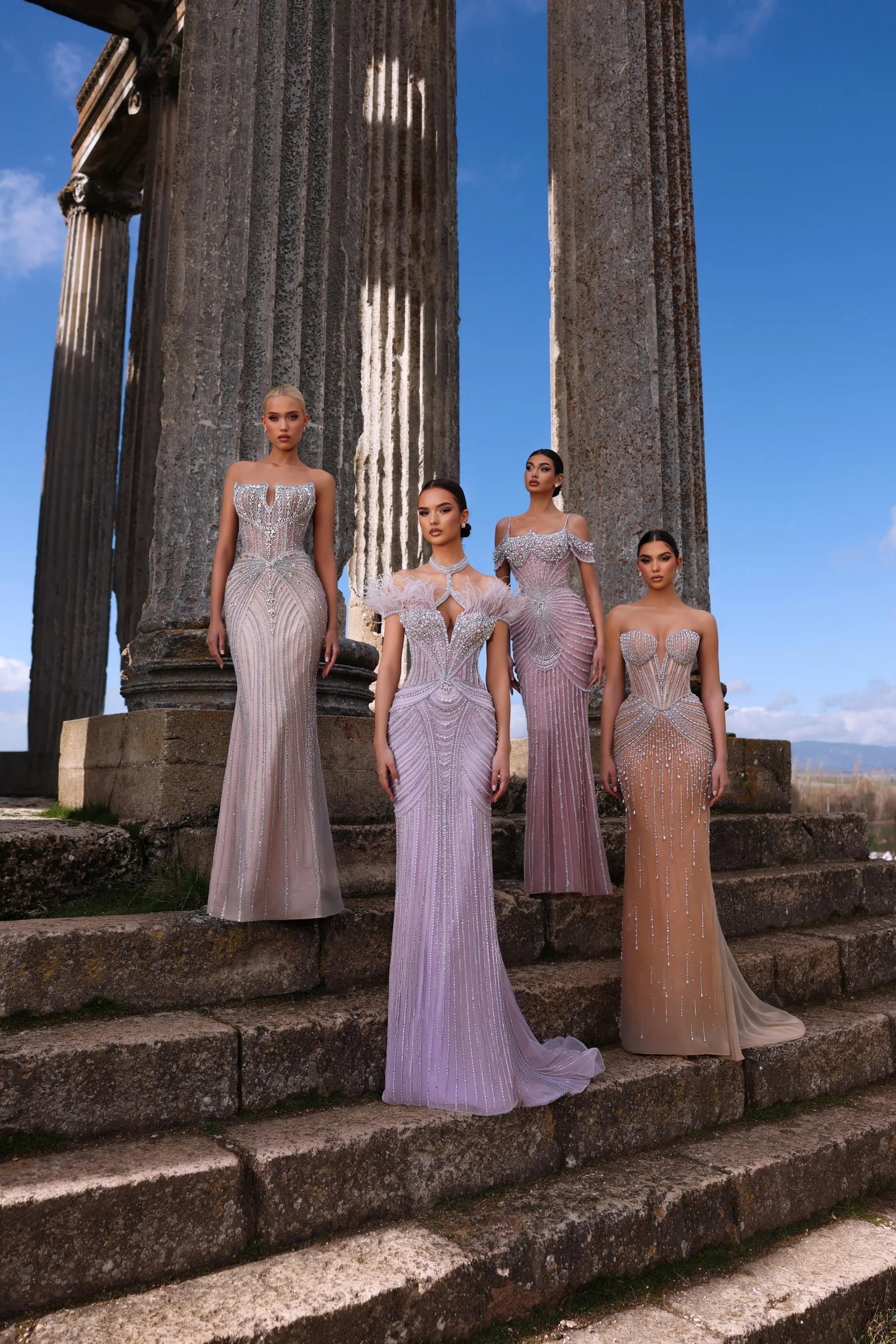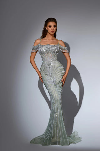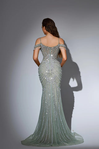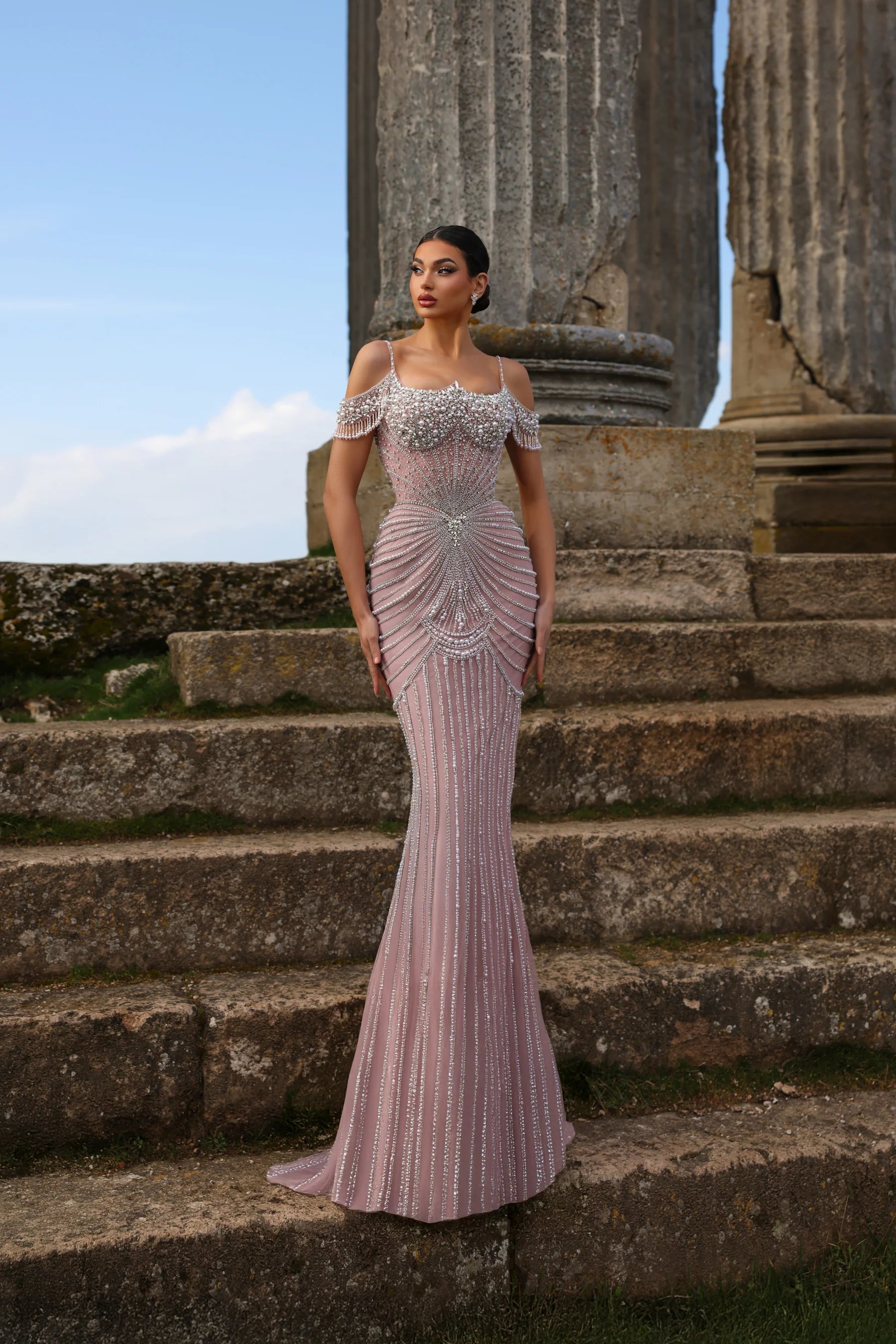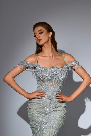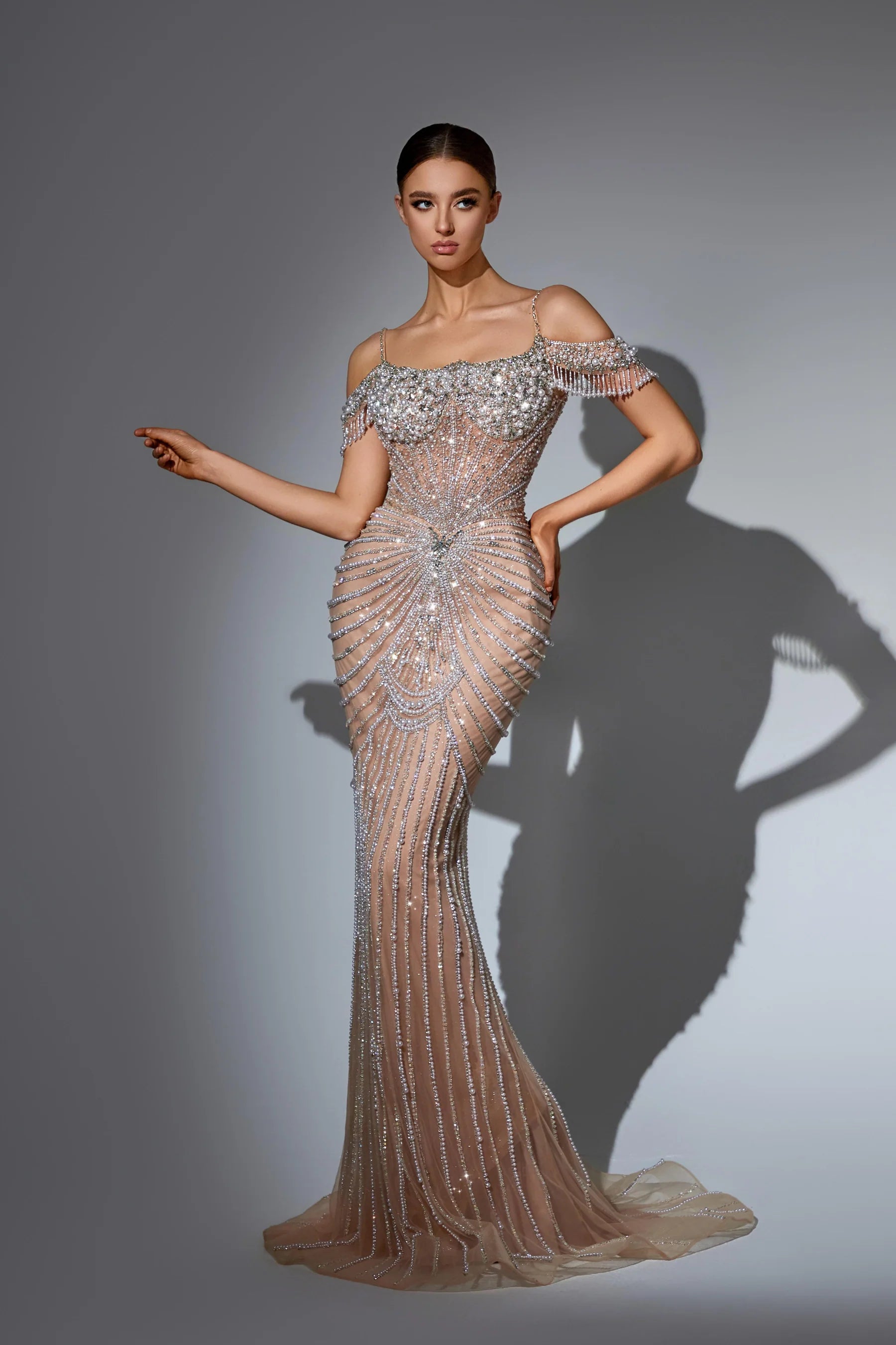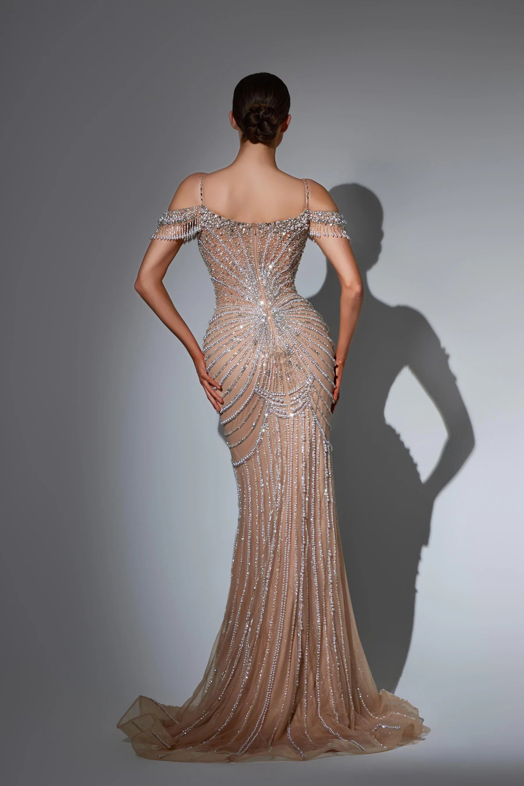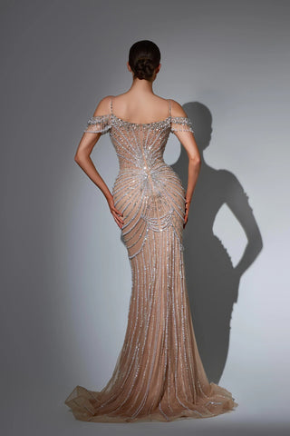 This luxurious evening gown is lavishly adorned with intricate hand-beaded embellishments that shimmer with every movement, showcasing exceptional craftsmanship and elegance. Designed to exude opulence and sophistication, it?? a true statement piece for any high-end occasion.