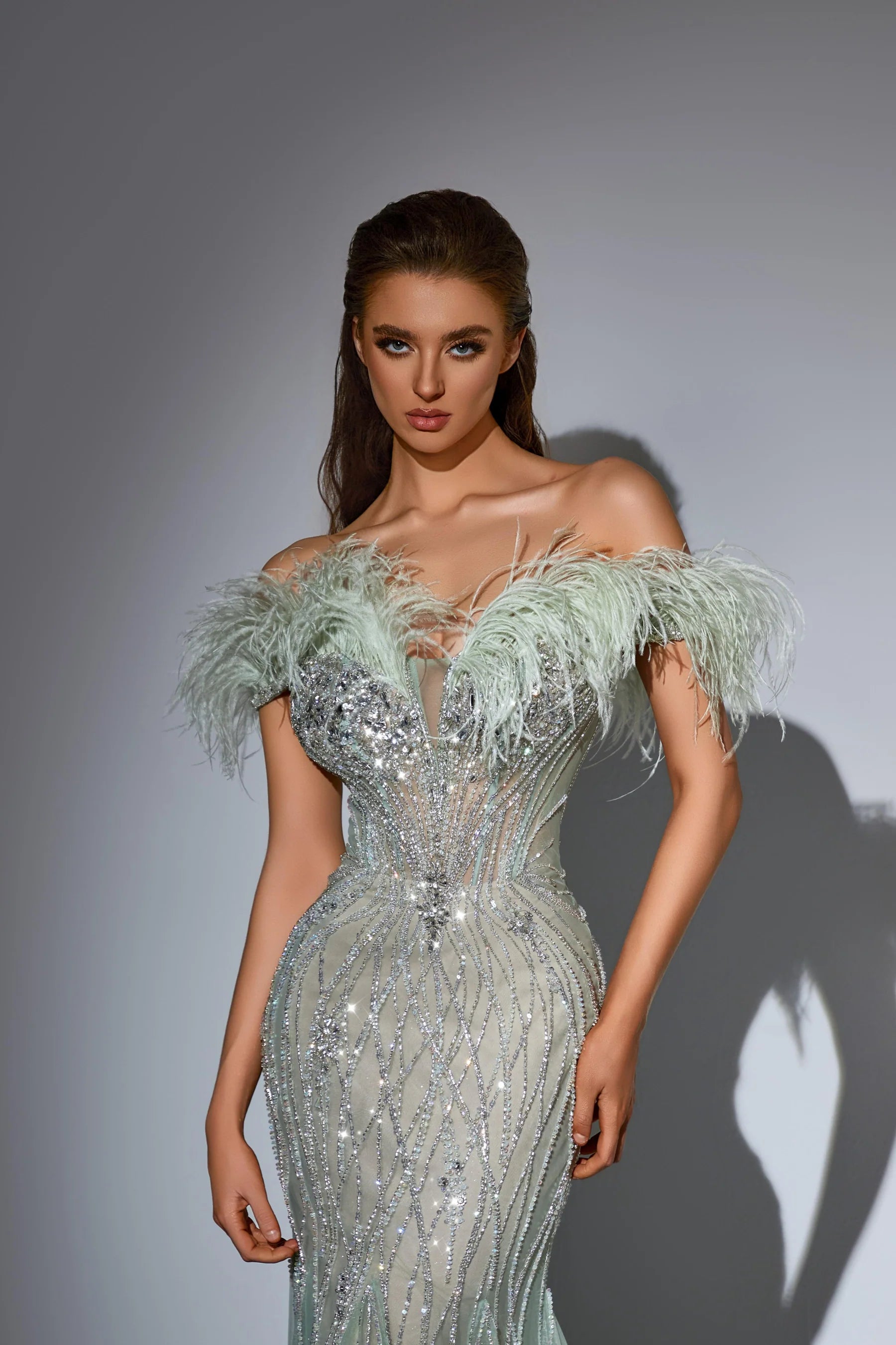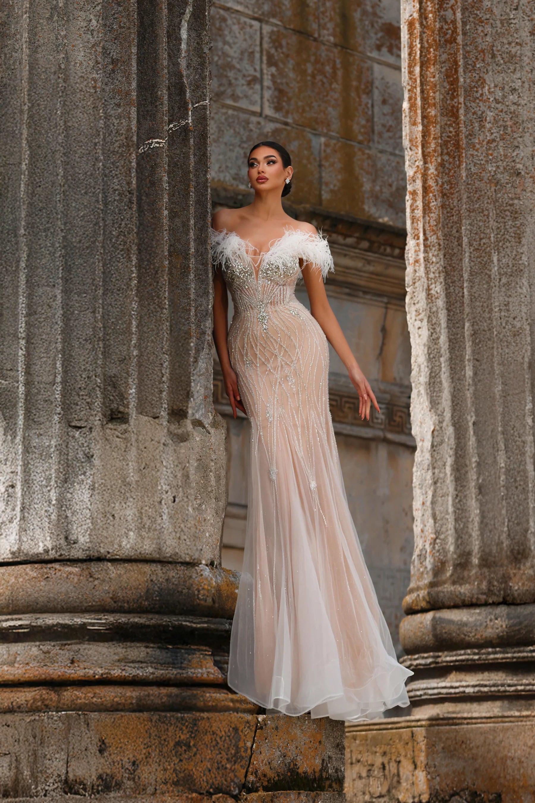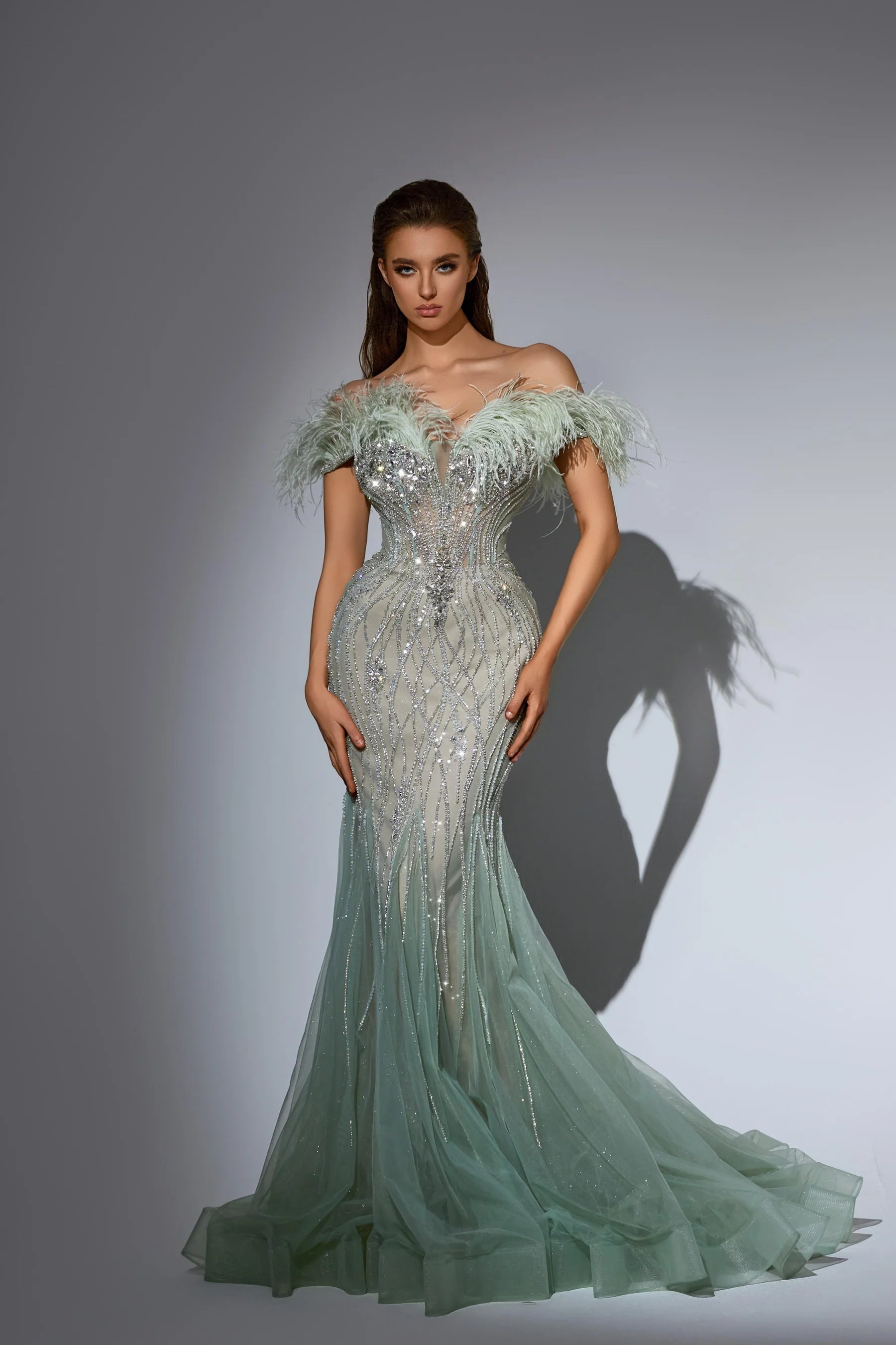 This luxurious evening gown is lavishly adorned with intricate hand-beaded embellishments that shimmer with every movement, showcasing exceptional craftsmanship and elegance. Designed to exude opulence and sophistication, it?? a true statement piece for any high-end occasion.