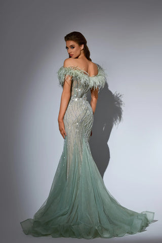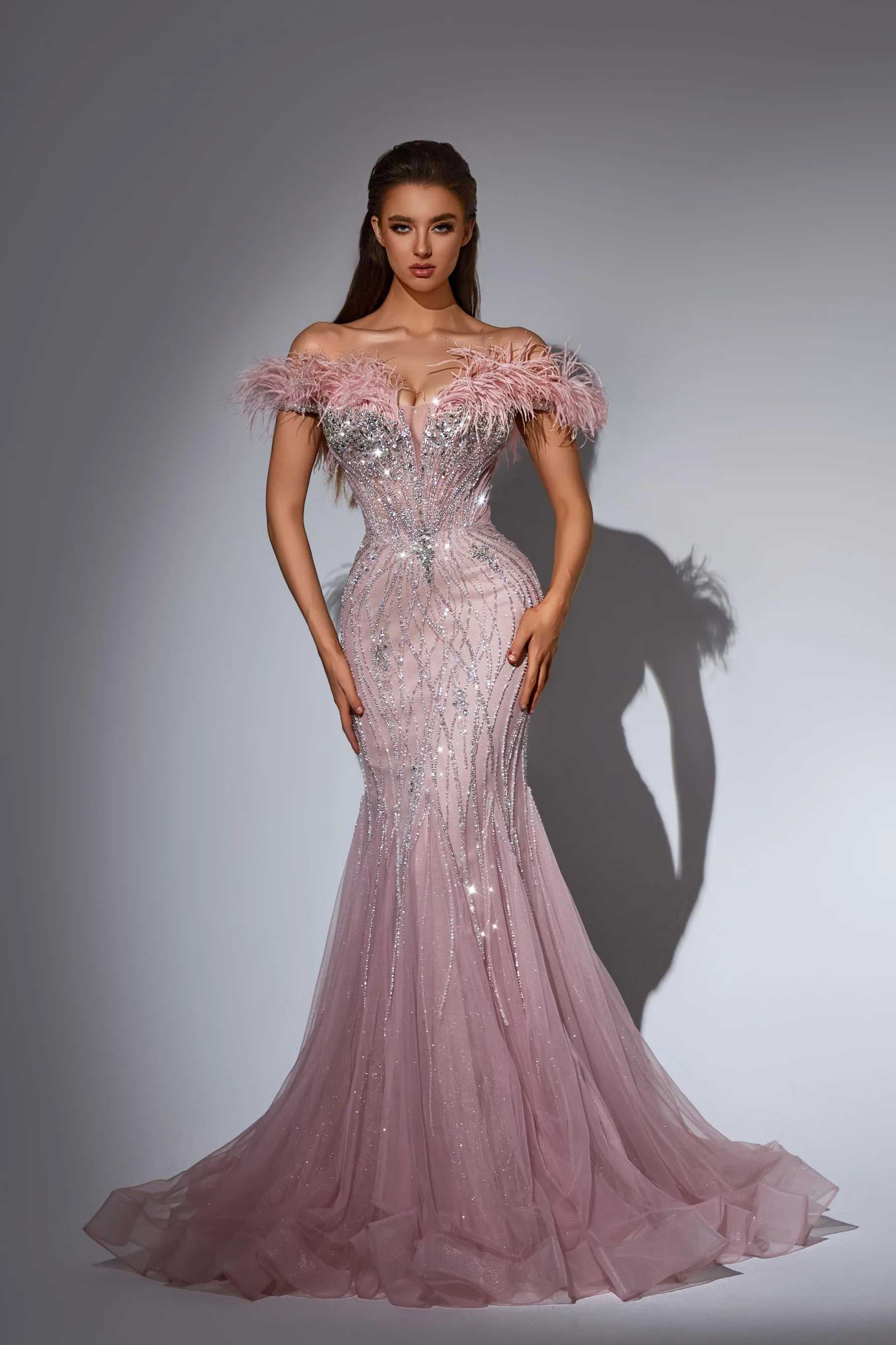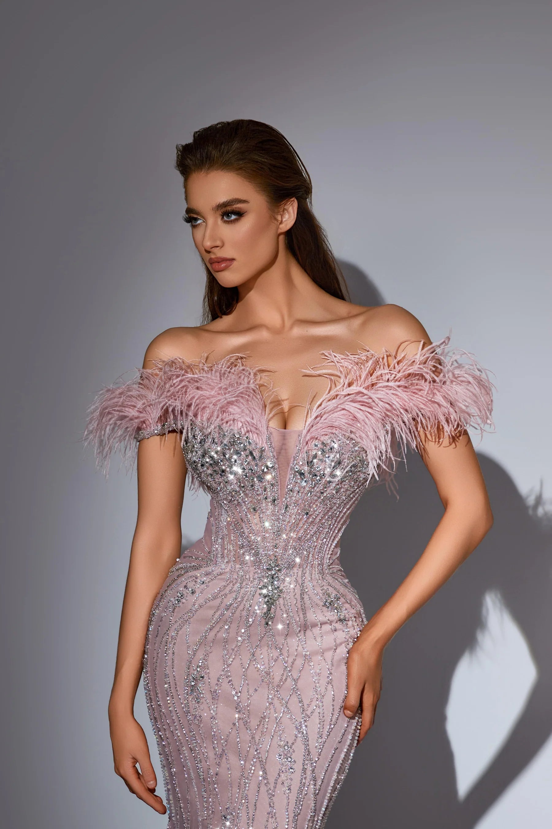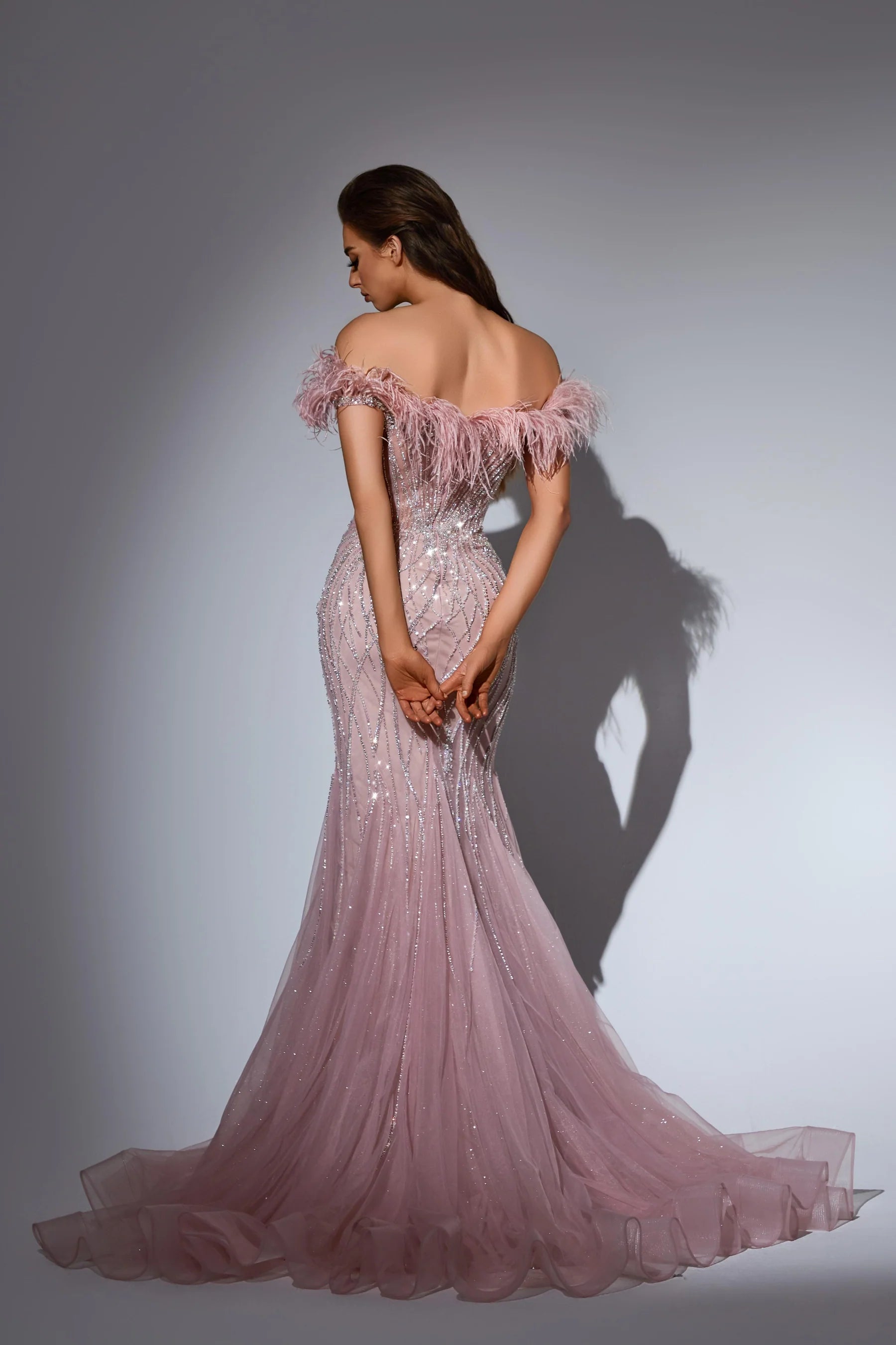 This luxurious evening gown is lavishly adorned with intricate hand-beaded embellishments that shimmer with every movement, showcasing exceptional craftsmanship and elegance. Designed to exude opulence and sophistication, it?? a true statement piece for any high-end occasion.