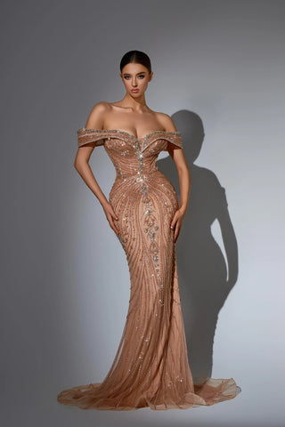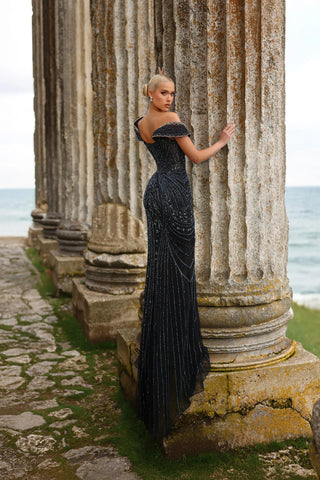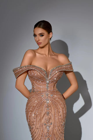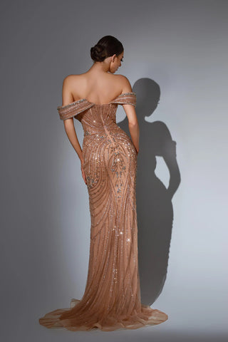 This luxurious evening gown is lavishly adorned with intricate hand-beaded embellishments that shimmer with every movement, showcasing exceptional craftsmanship and elegance. Designed to exude opulence and sophistication, it?? a true statement piece for any high-end occasion.