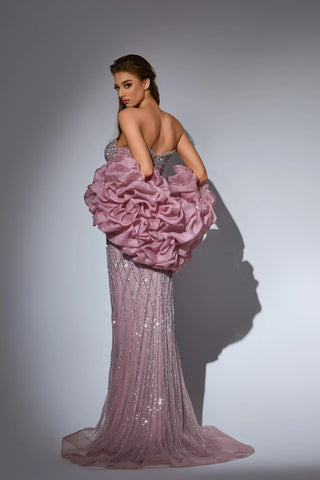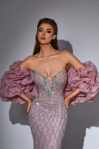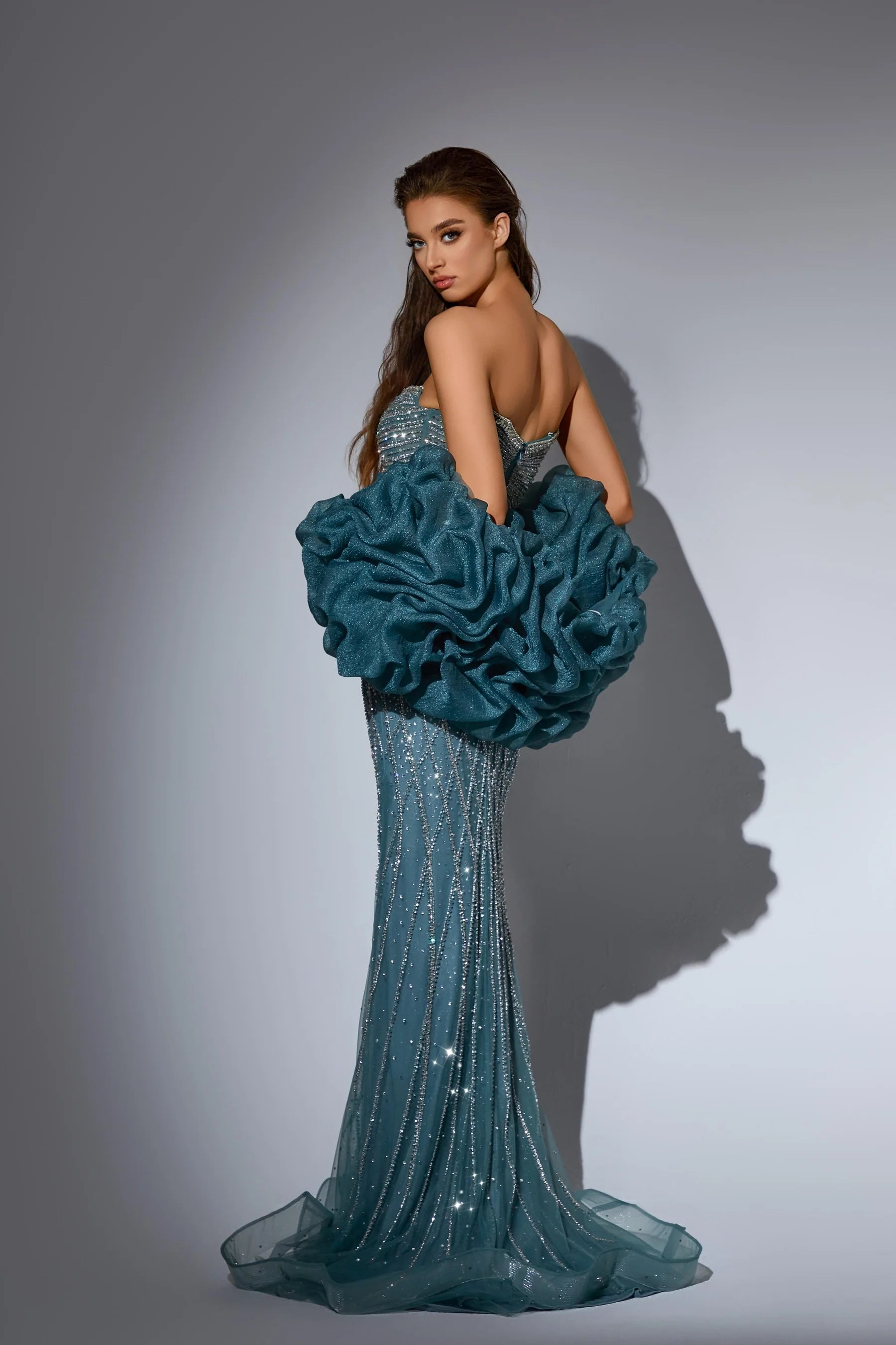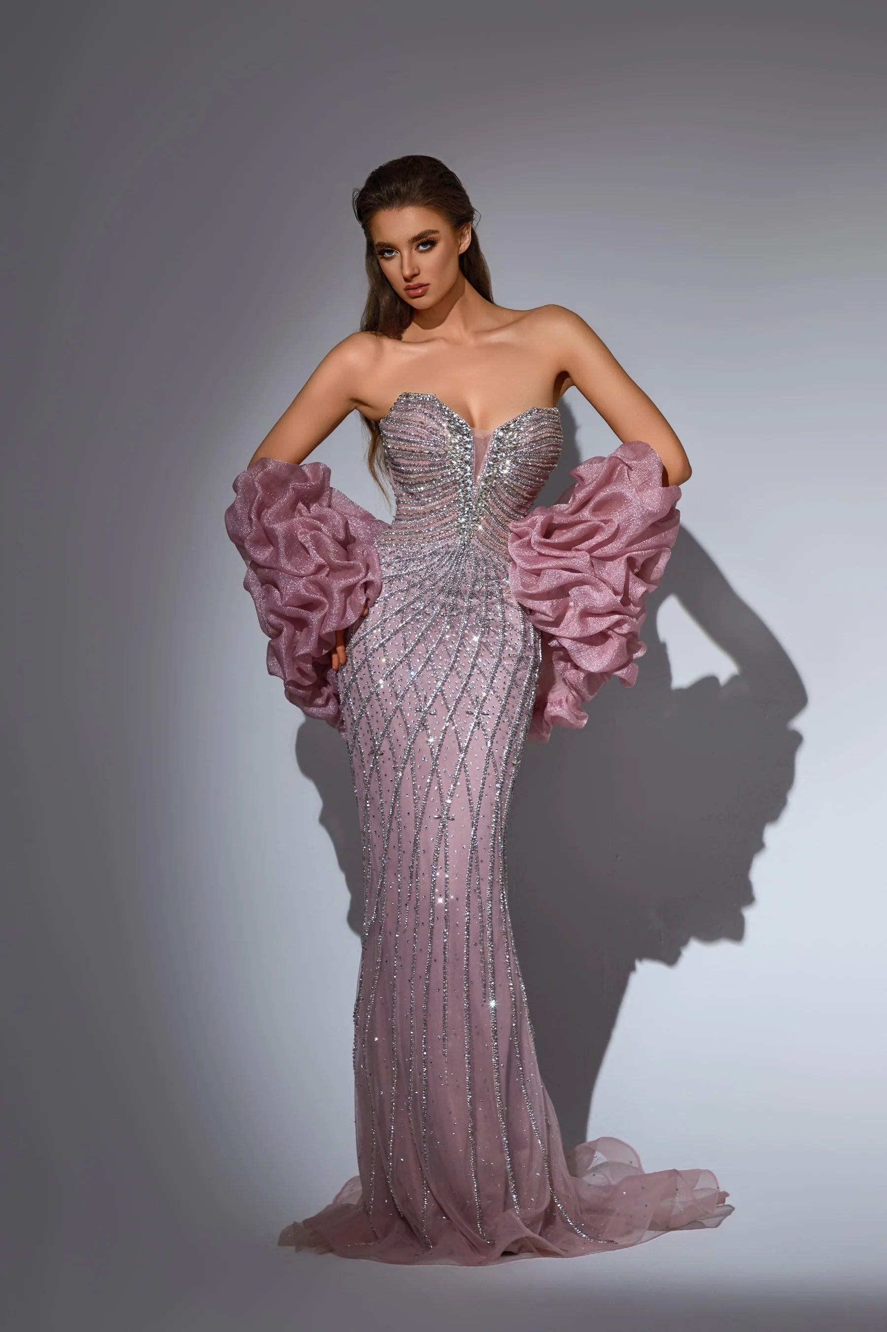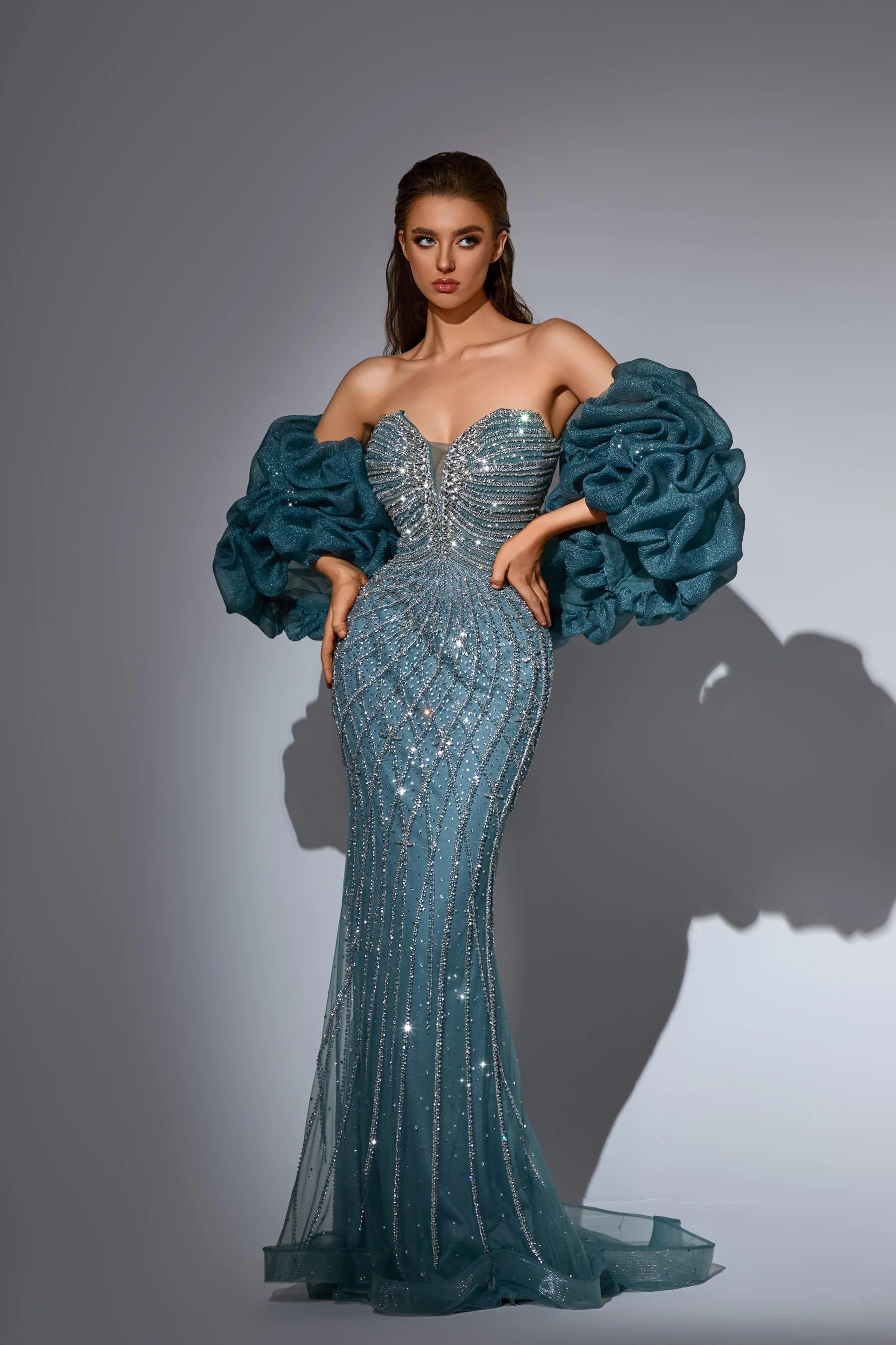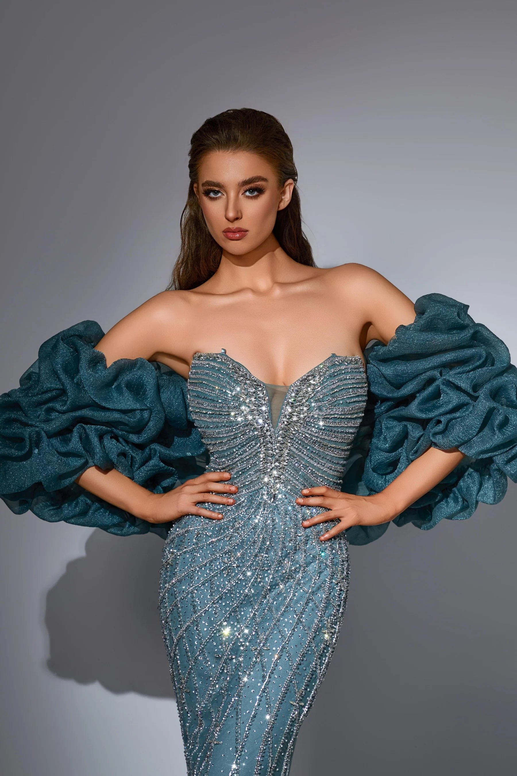 This luxurious evening gown is lavishly adorned with intricate hand-beaded embellishments that shimmer with every movement, showcasing exceptional craftsmanship and elegance. Designed to exude opulence and sophistication, it?? a true statement piece for any high-end occasion.