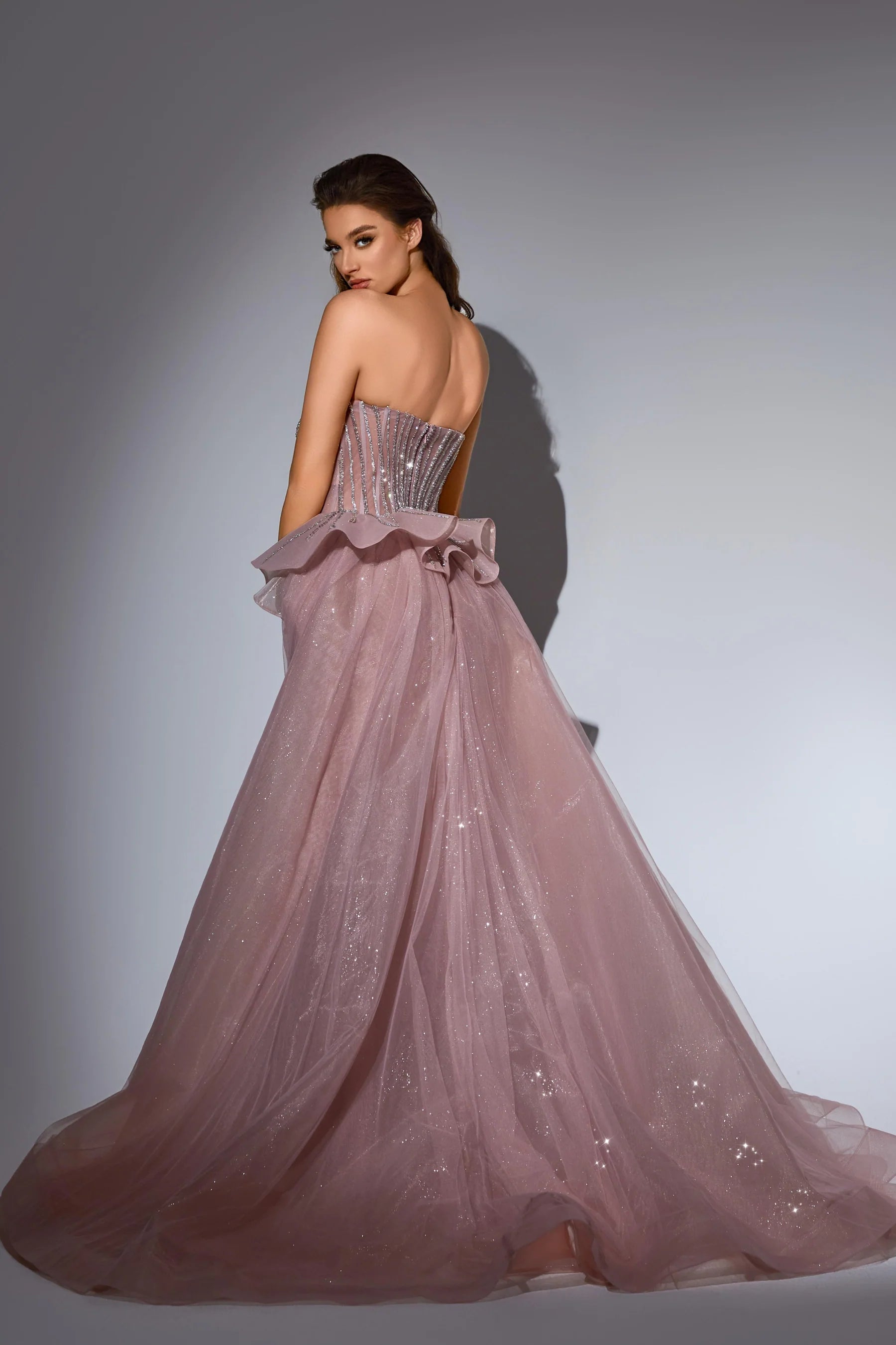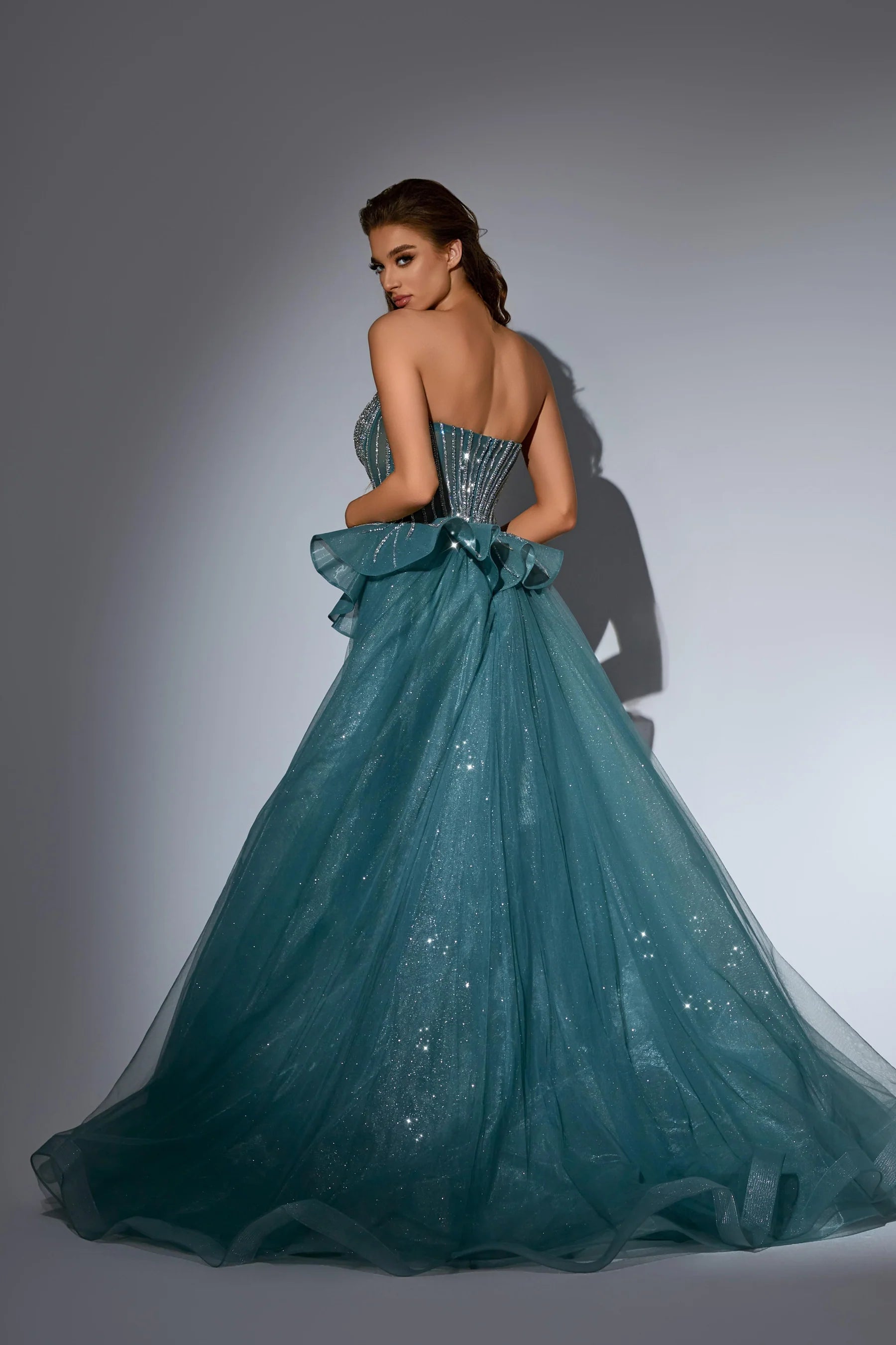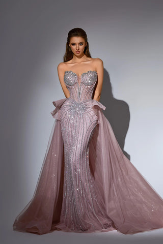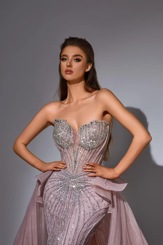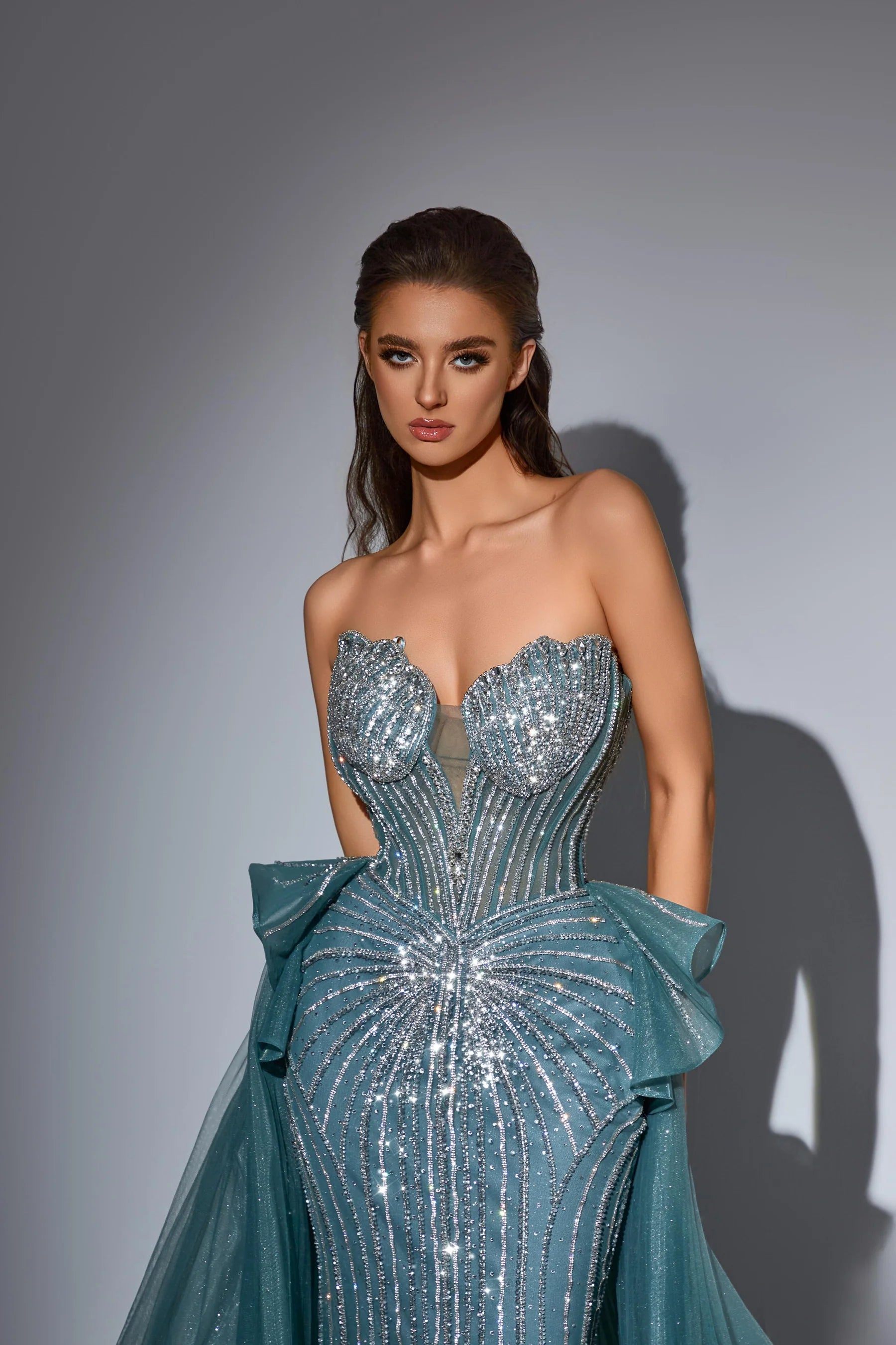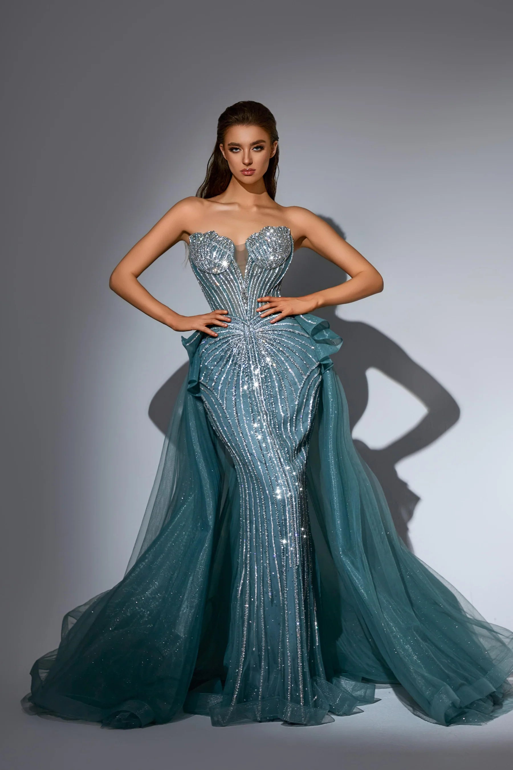This luxurious evening gown is lavishly adorned with intricate hand-beaded embellishments that shimmer with every movement, showcasing exceptional craftsmanship and elegance. Designed to exude opulence and sophistication, it?? a true statement piece for any high-end occasion.