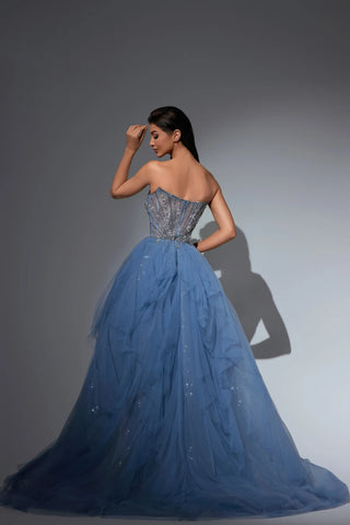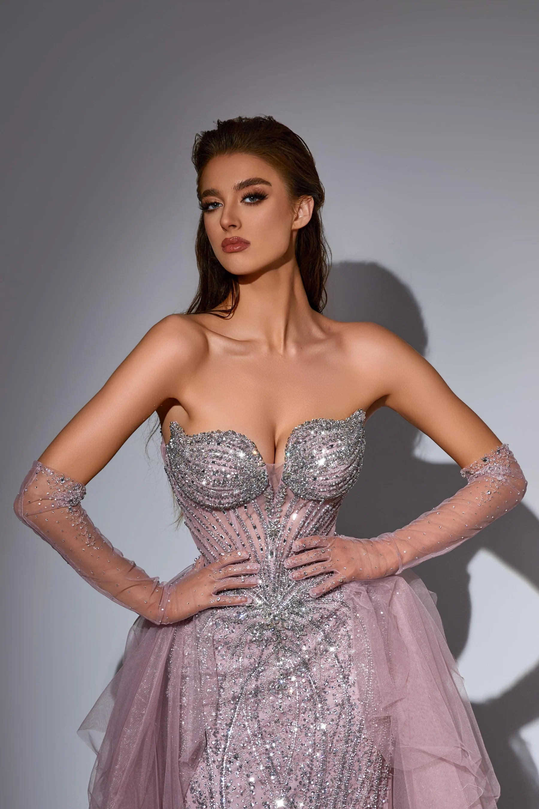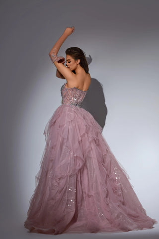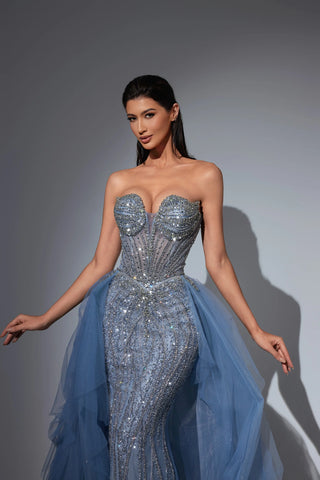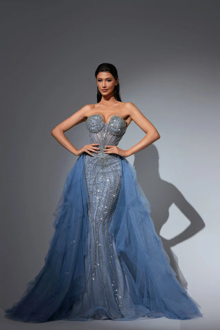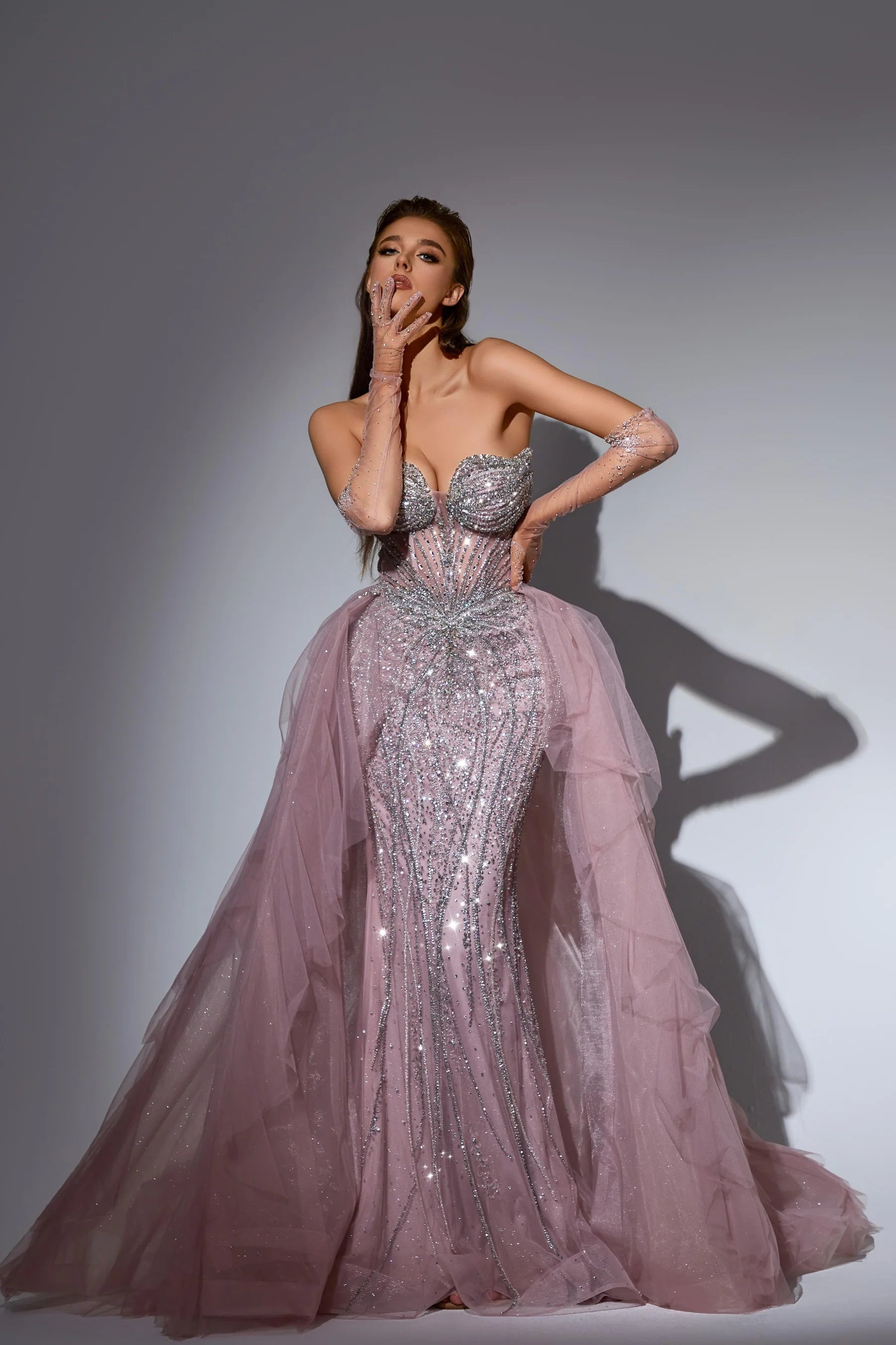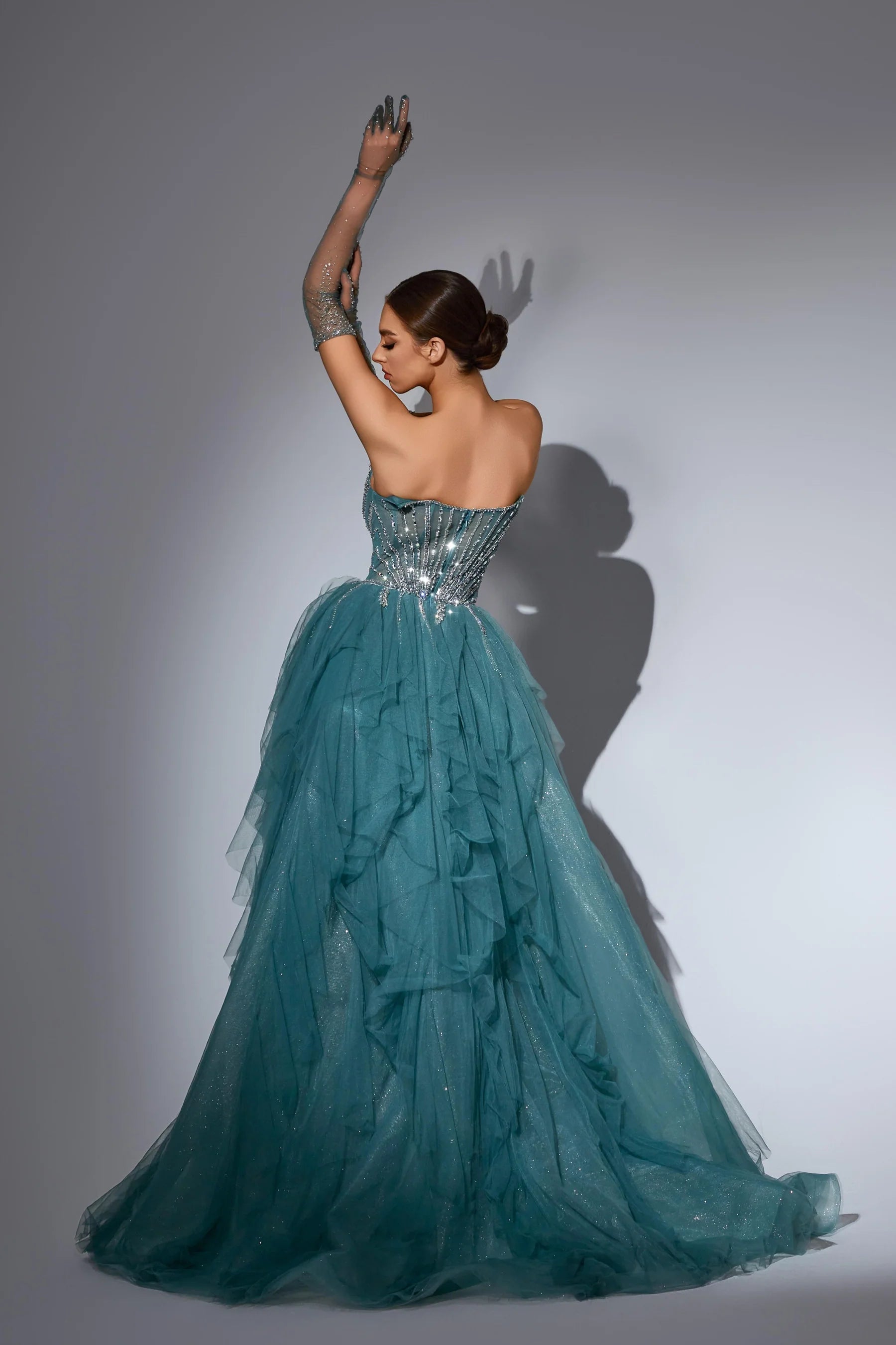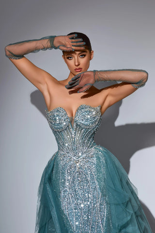 This luxurious evening gown is lavishly adorned with intricate hand-beaded embellishments that shimmer with every movement, showcasing exceptional craftsmanship and elegance. Designed to exude opulence and sophistication, it?? a true statement piece for any high-end occasion.