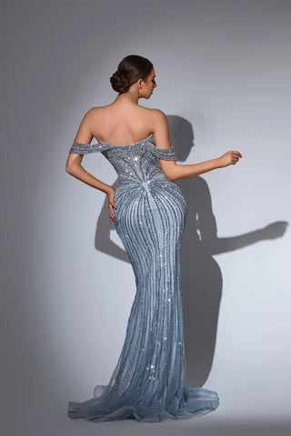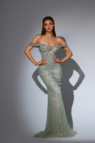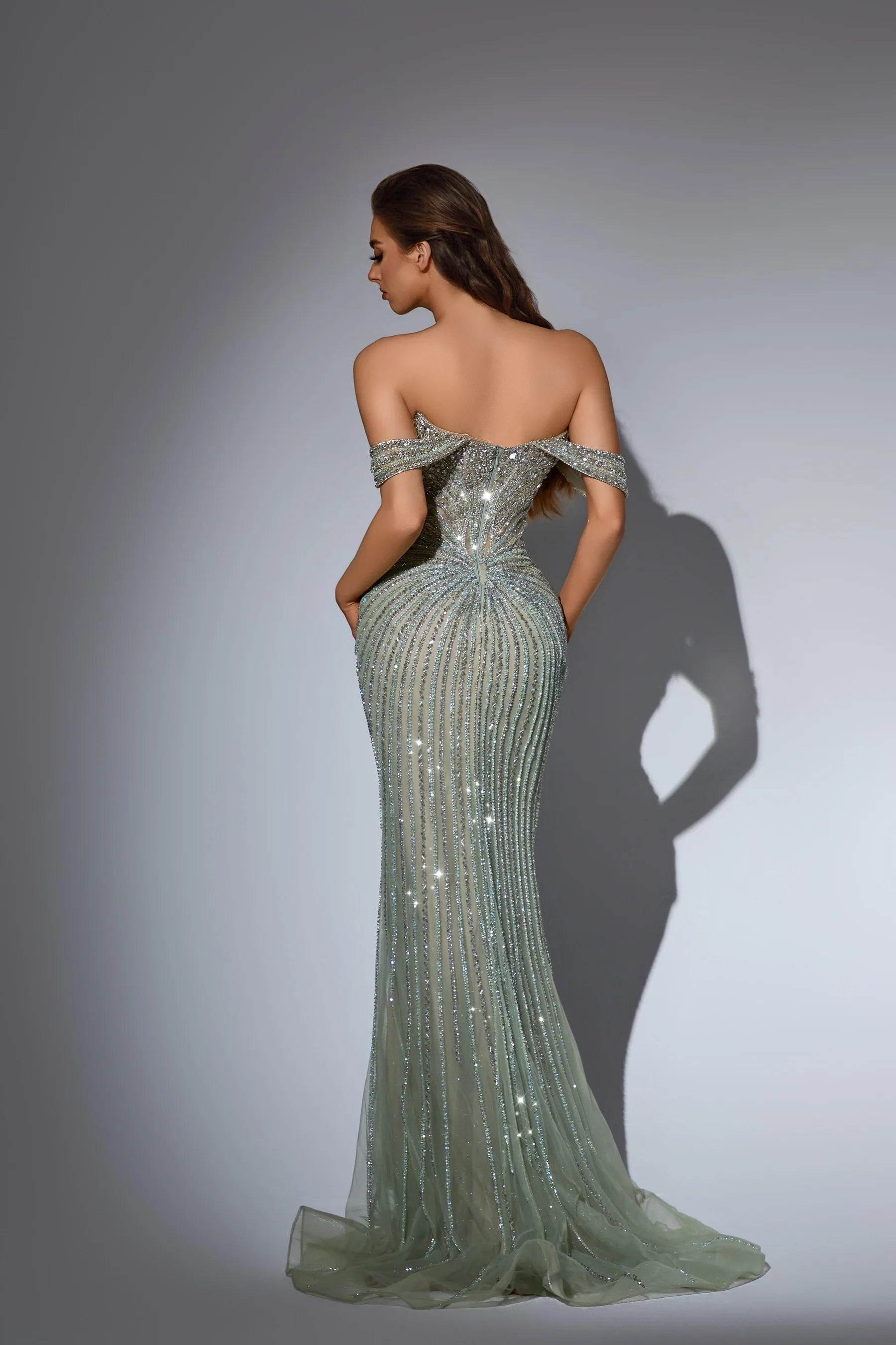 This luxurious evening gown is lavishly adorned with intricate hand-beaded embellishments that shimmer with every movement, showcasing exceptional craftsmanship and elegance. Designed to exude opulence and sophistication, it?? a true statement piece for any high-end occasion.