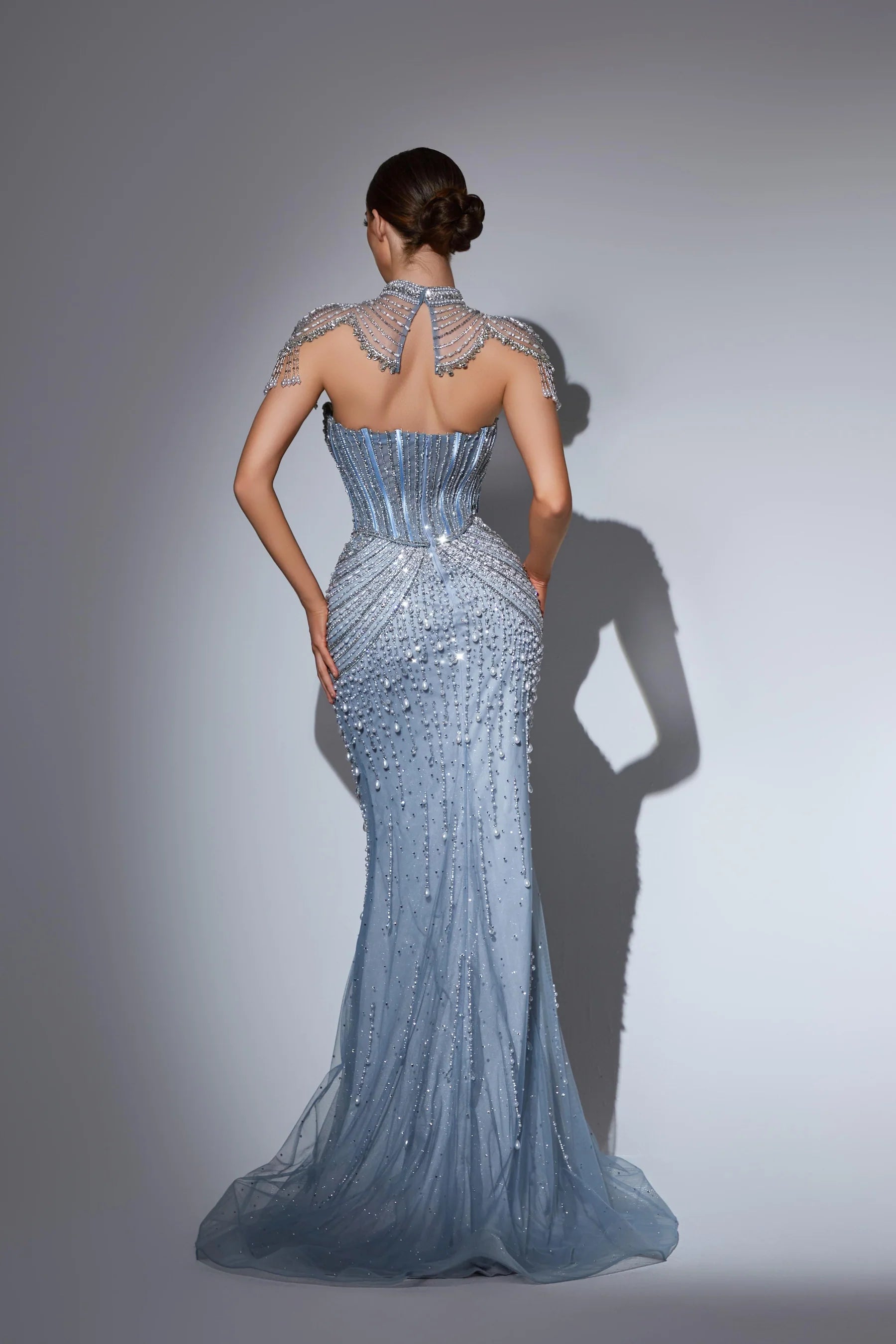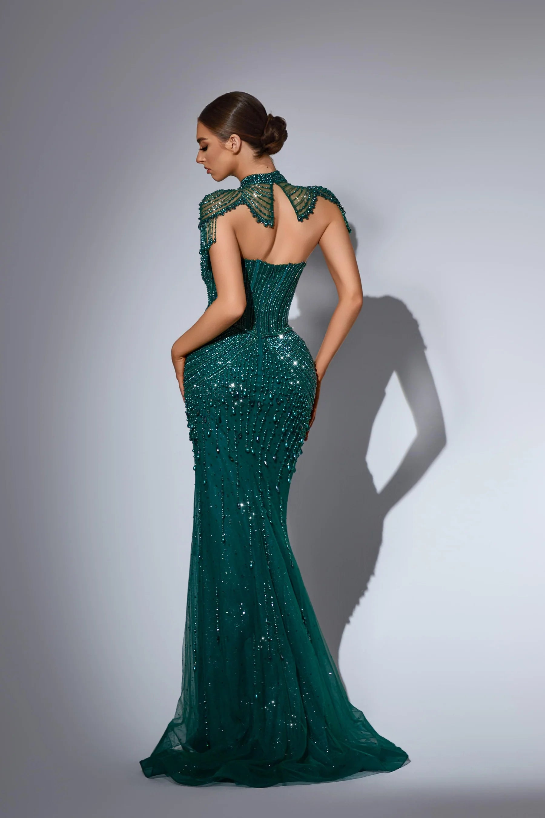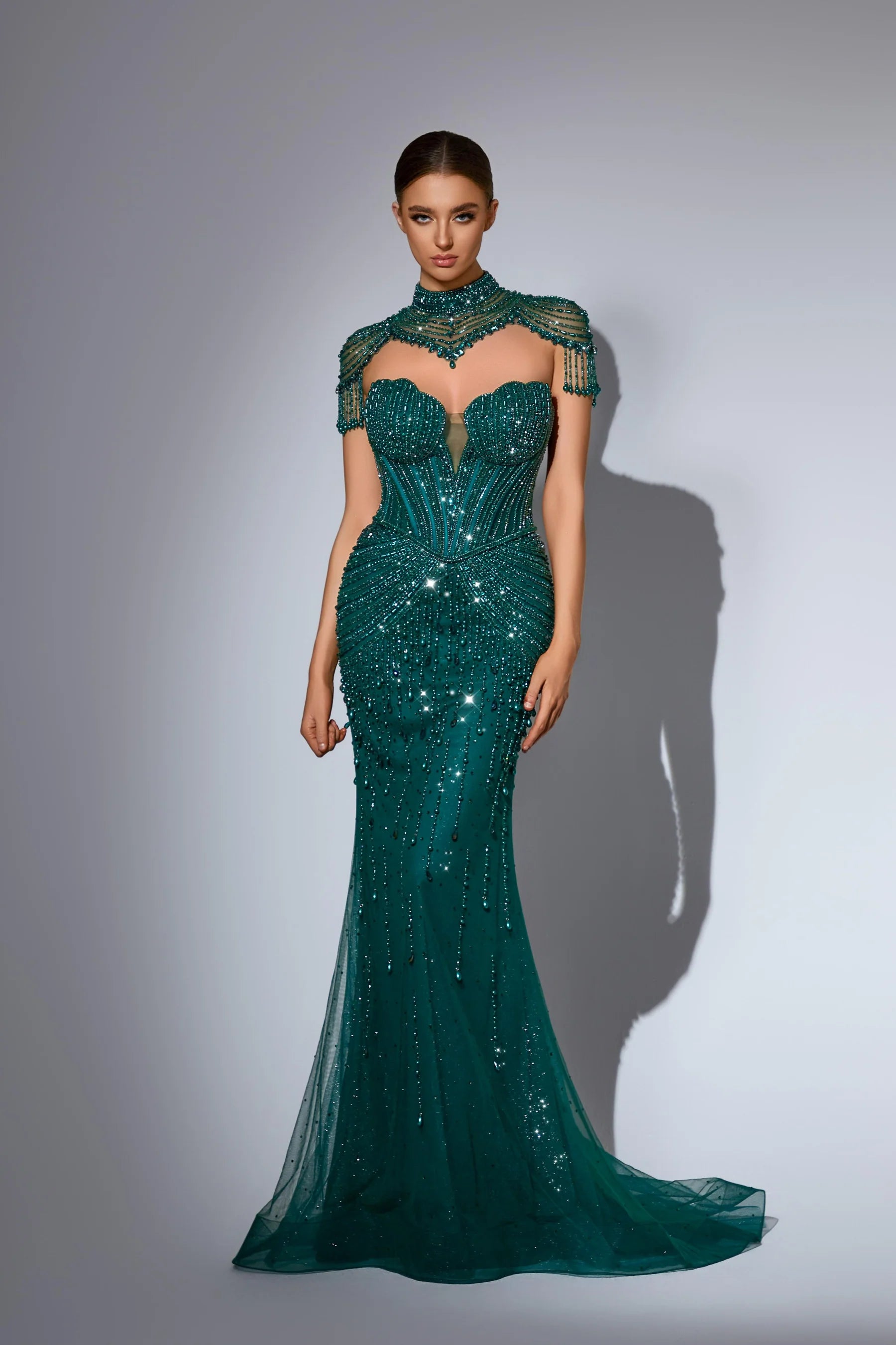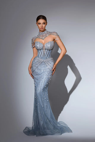 This luxurious evening gown is lavishly adorned with intricate hand-beaded embellishments that shimmer with every movement, showcasing exceptional craftsmanship and elegance. Designed to exude opulence and sophistication, it?? a true statement piece for any high-end occasion.