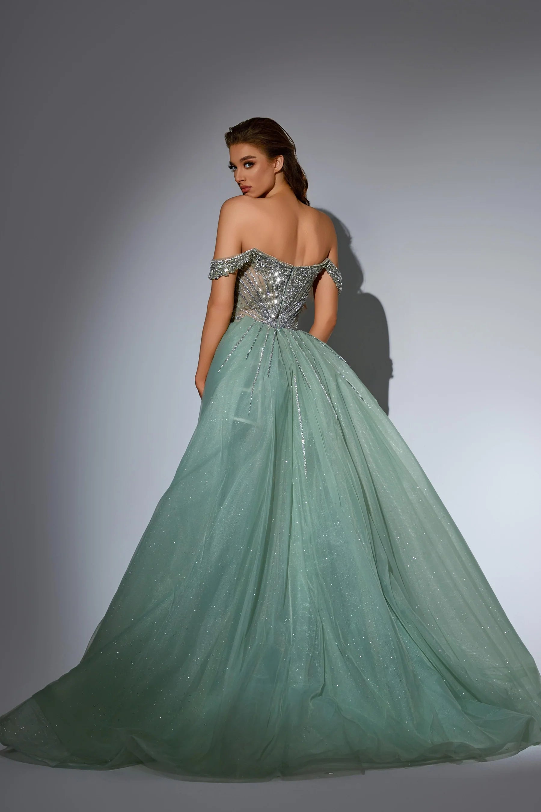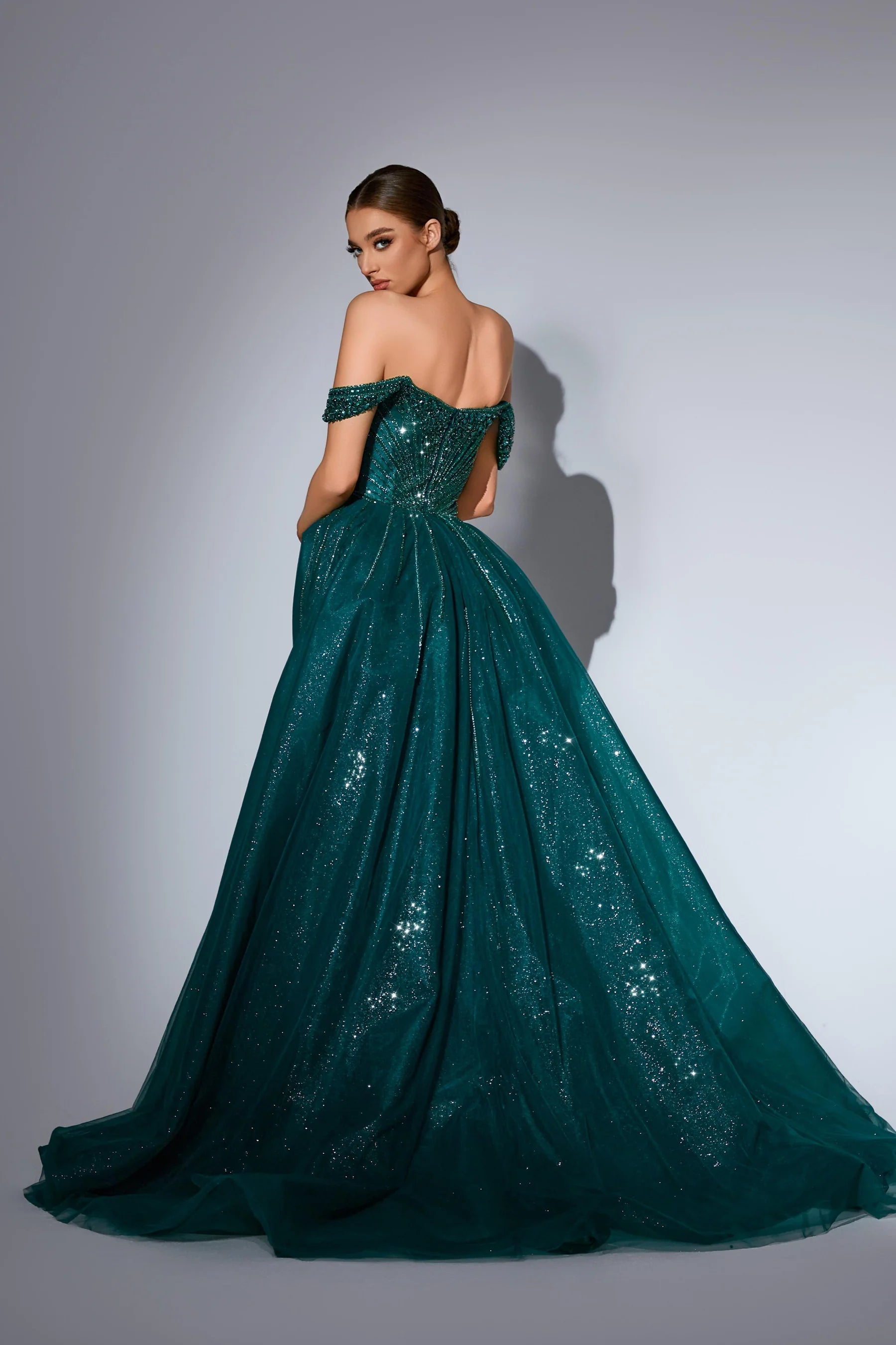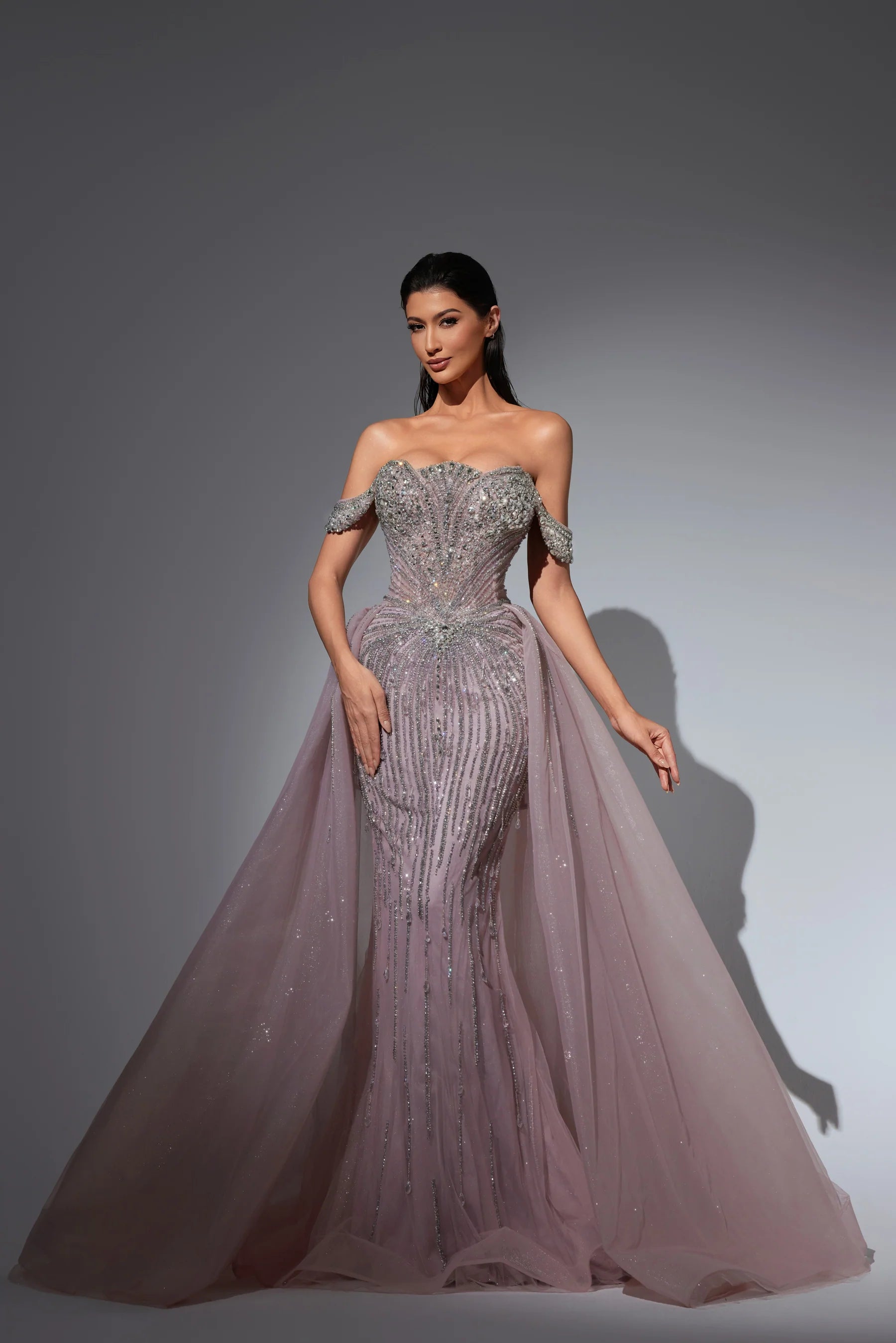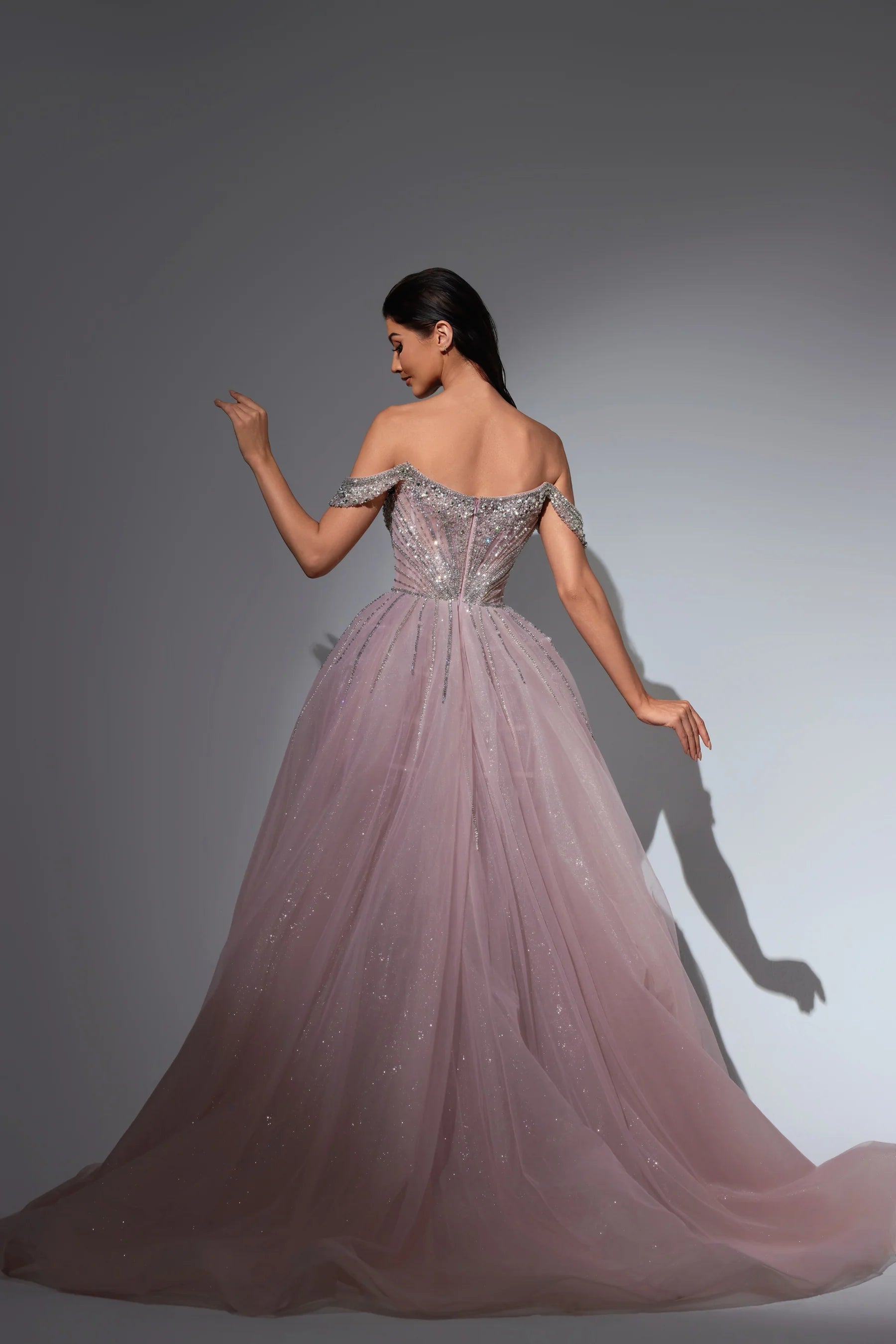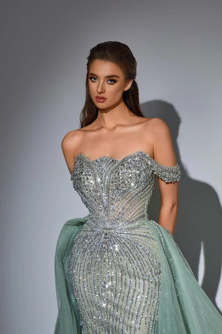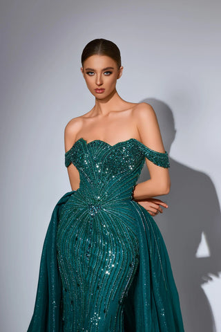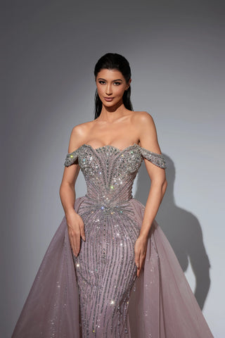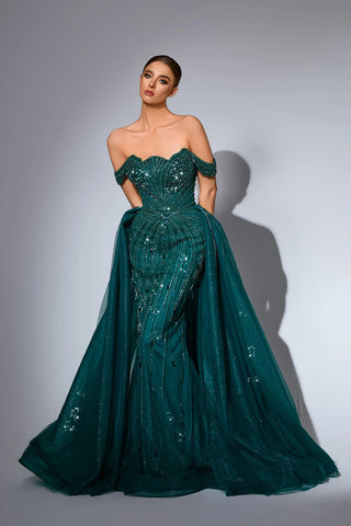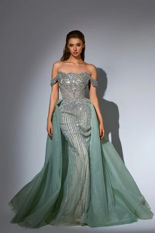 This luxurious evening gown is lavishly adorned with intricate hand-beaded embellishments that shimmer with every movement, showcasing exceptional craftsmanship and elegance. Designed to exude opulence and sophistication, it?? a true statement piece for any high-end occasion.