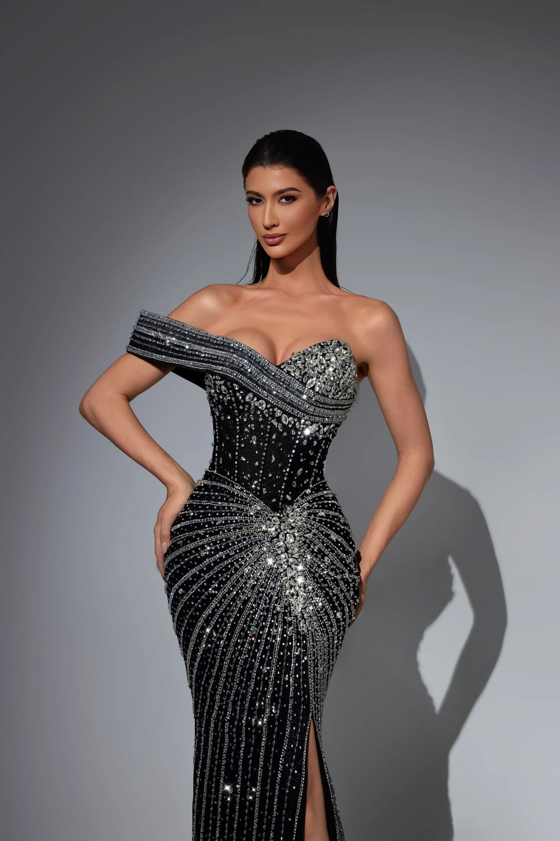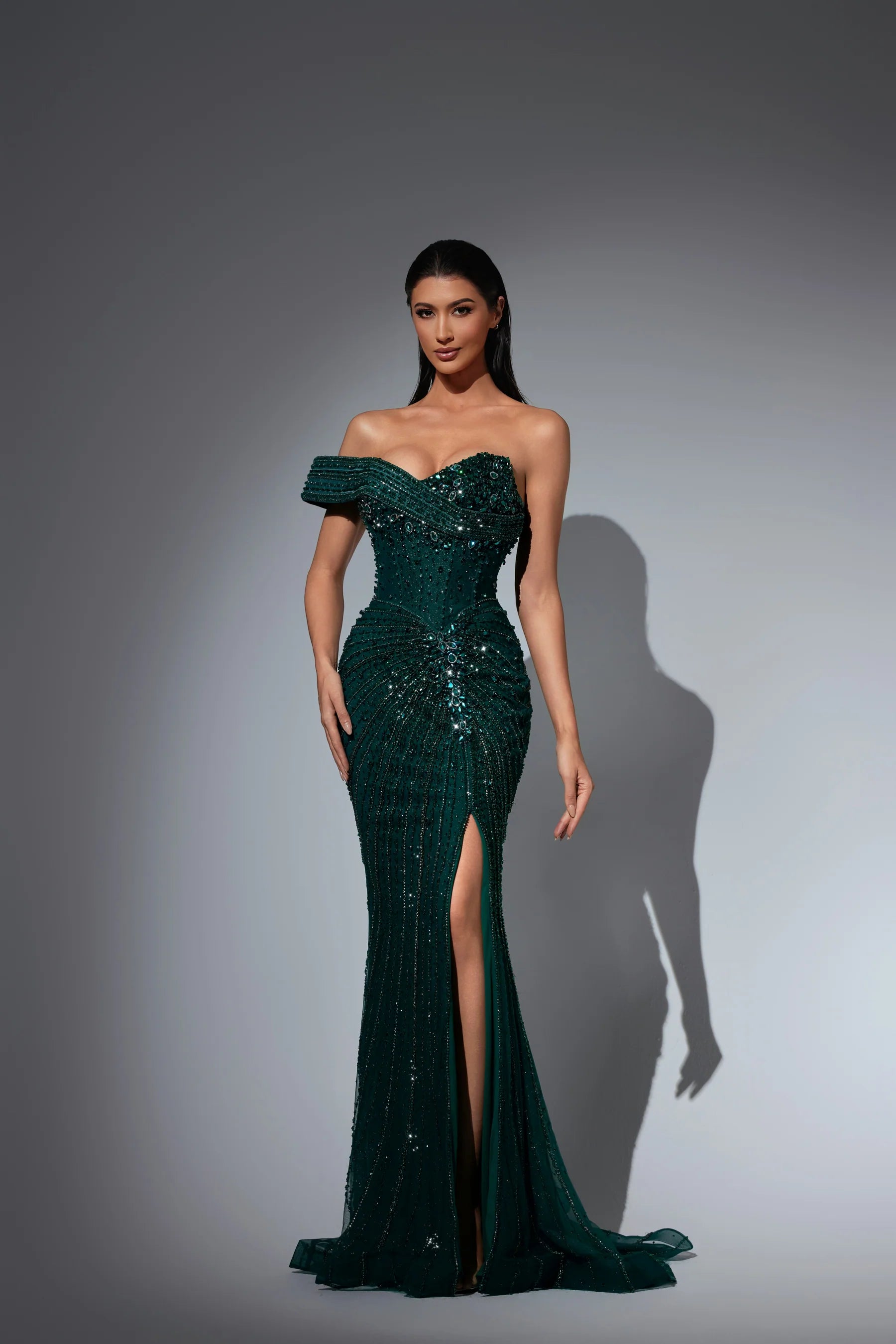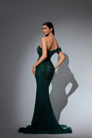 This luxurious evening gown is lavishly adorned with intricate hand-beaded embellishments that shimmer with every movement, showcasing exceptional craftsmanship and elegance. Designed to exude opulence and sophistication, it?? a true statement piece for any high-end occasion.