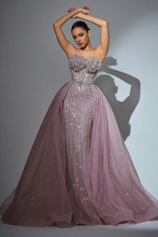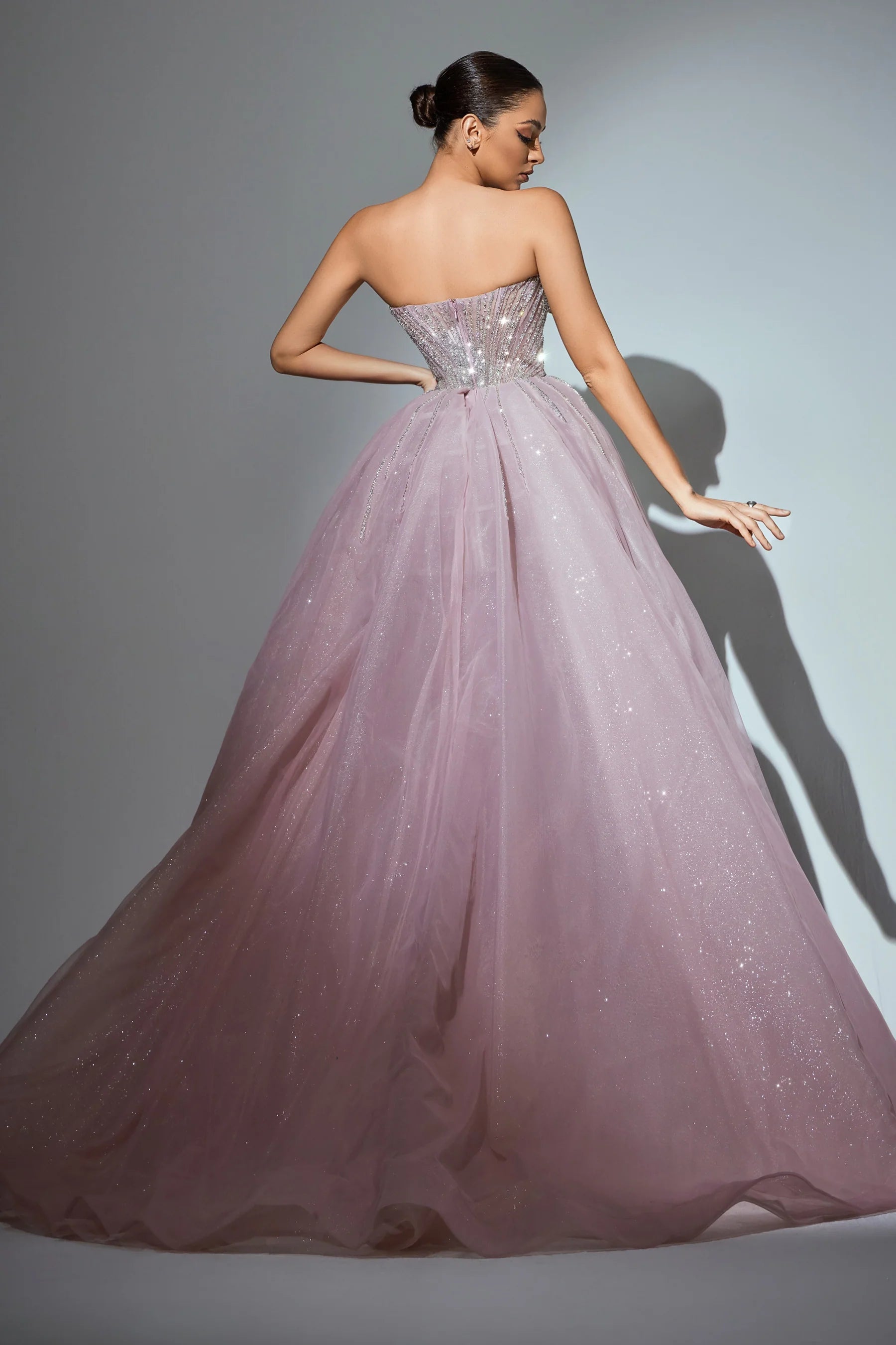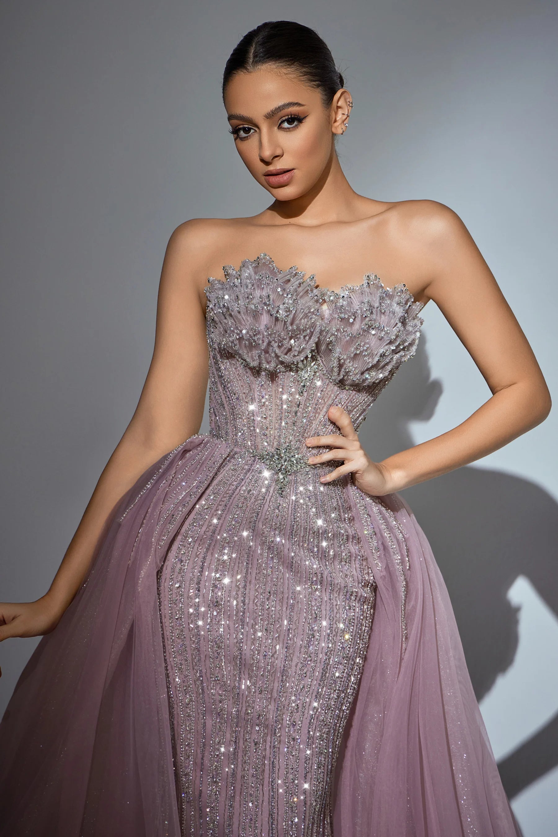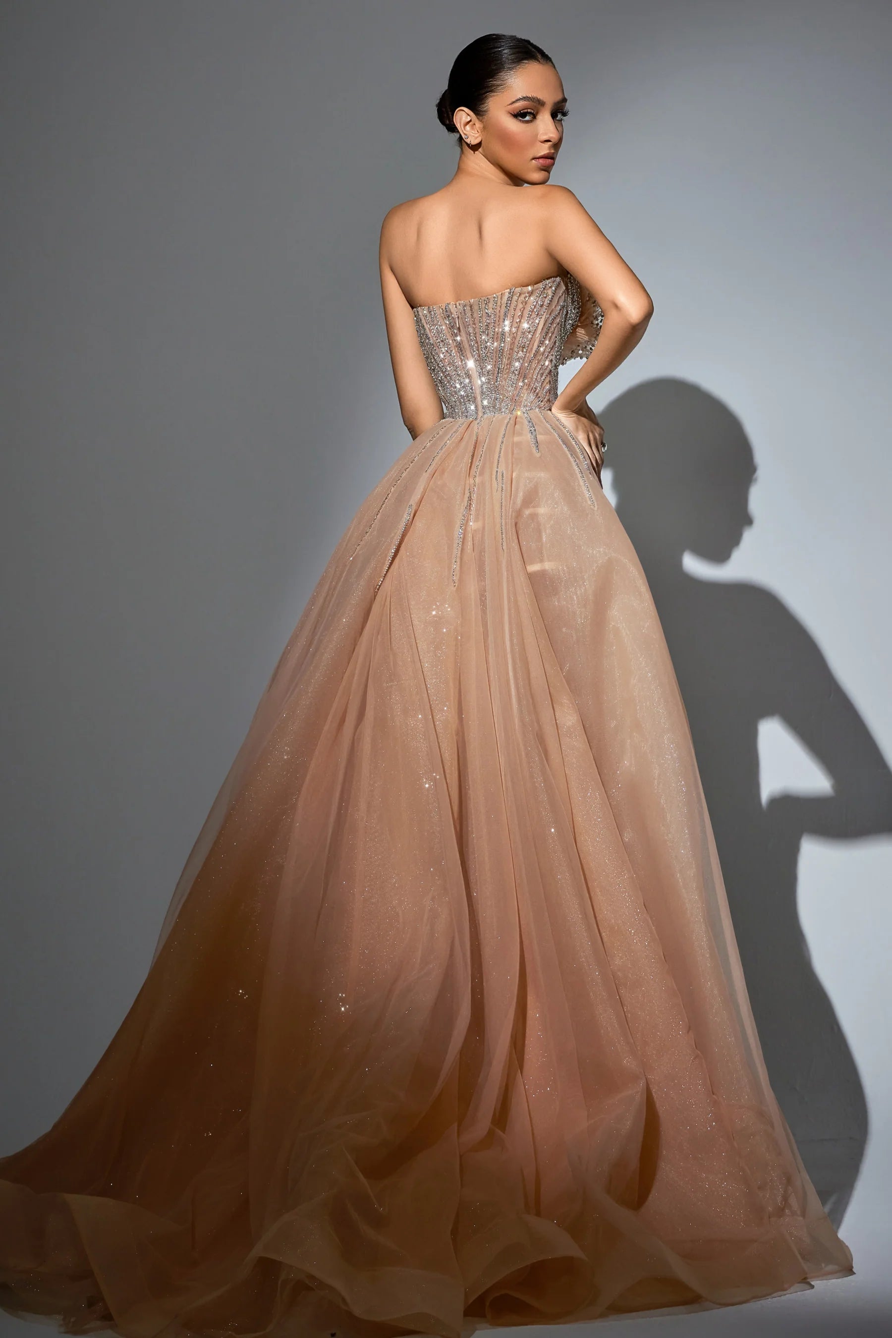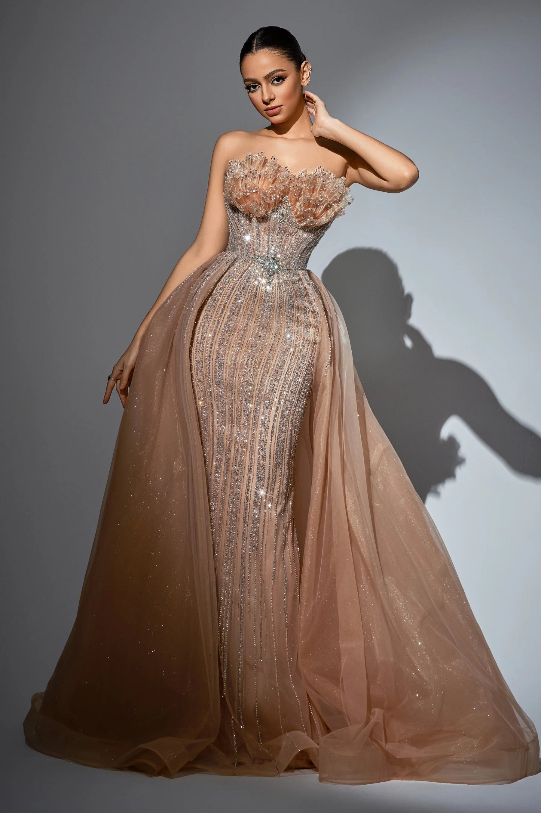 This luxurious evening gown is lavishly adorned with intricate hand-beaded embellishments that shimmer with every movement, showcasing exceptional craftsmanship and elegance. Designed to exude opulence and sophistication, it?? a true statement piece for any high-end occasion.