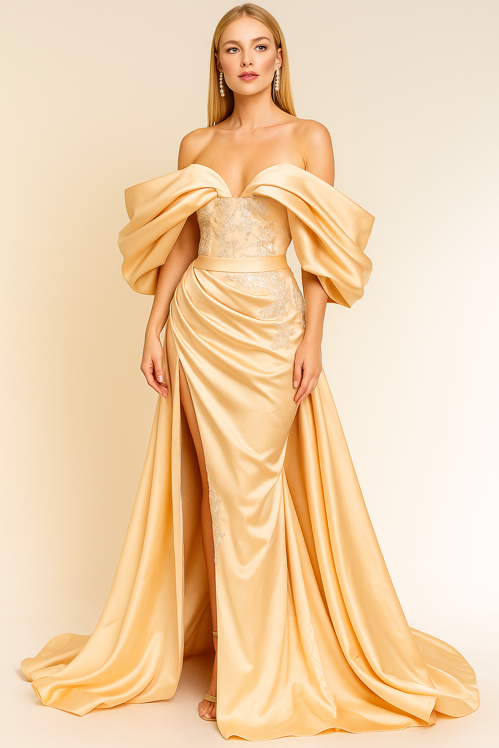 OLV152 is an opulent off-the-shoulder gown crafted from luxurious satin. The sculpted bodice features delicate lace embroidery and a flattering draped waist that cascades into a high side split. Voluminous statement sleeves add drama and sophistication, while the floor-length train completes this regal silhouette, perfect for a grand evening affair.
