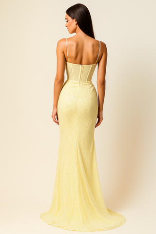 OLV157 is a strapless evening gown featuring a structured sheer corset bodice adorned with shimmering beadwork and delicate fringe detail. The fitted skirt is embellished with sequin embroidery throughout and finished with a thigh-high side split, creating a striking and glamorous silhouette.