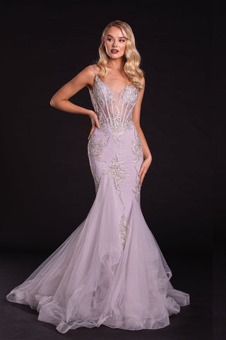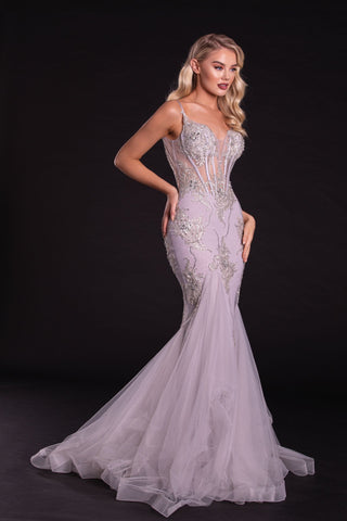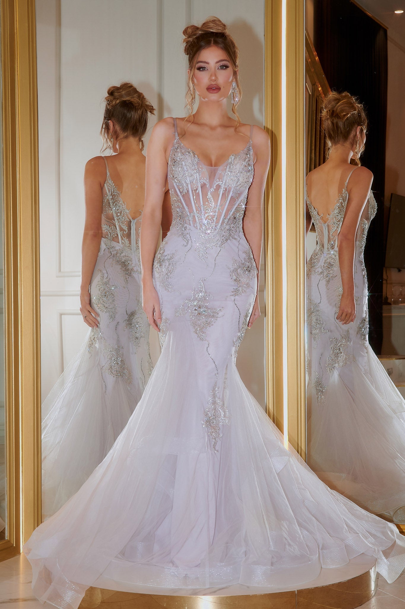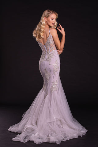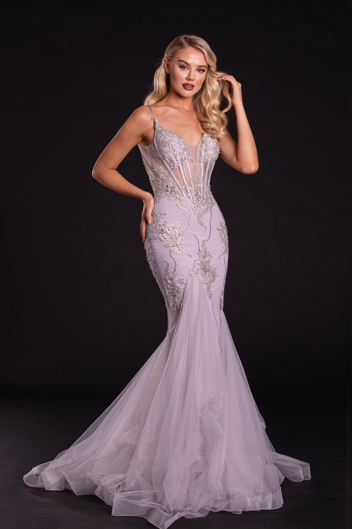 Portia and Scarlett PS211 4 is Pageant Evening and Prom Gown Ready made with the 2 21 season lace, handmade and intricately layered, encrusted with crystals rhinestones over metallic 3d lace. The modern exposed corseted bodice sinches the waist and flattered the hips with the vee shaped silhouette. The Gown has a centre back zipper and an organza tulle skirt. The dress is a standard size make with moderate stretch, the model wears size 2 and is 175cm tall wearing 1 cm high heels. Base fabric is Power mesh Body Con overlayed with netting and Organza Skirt.