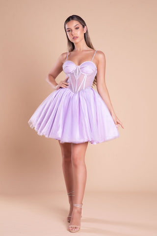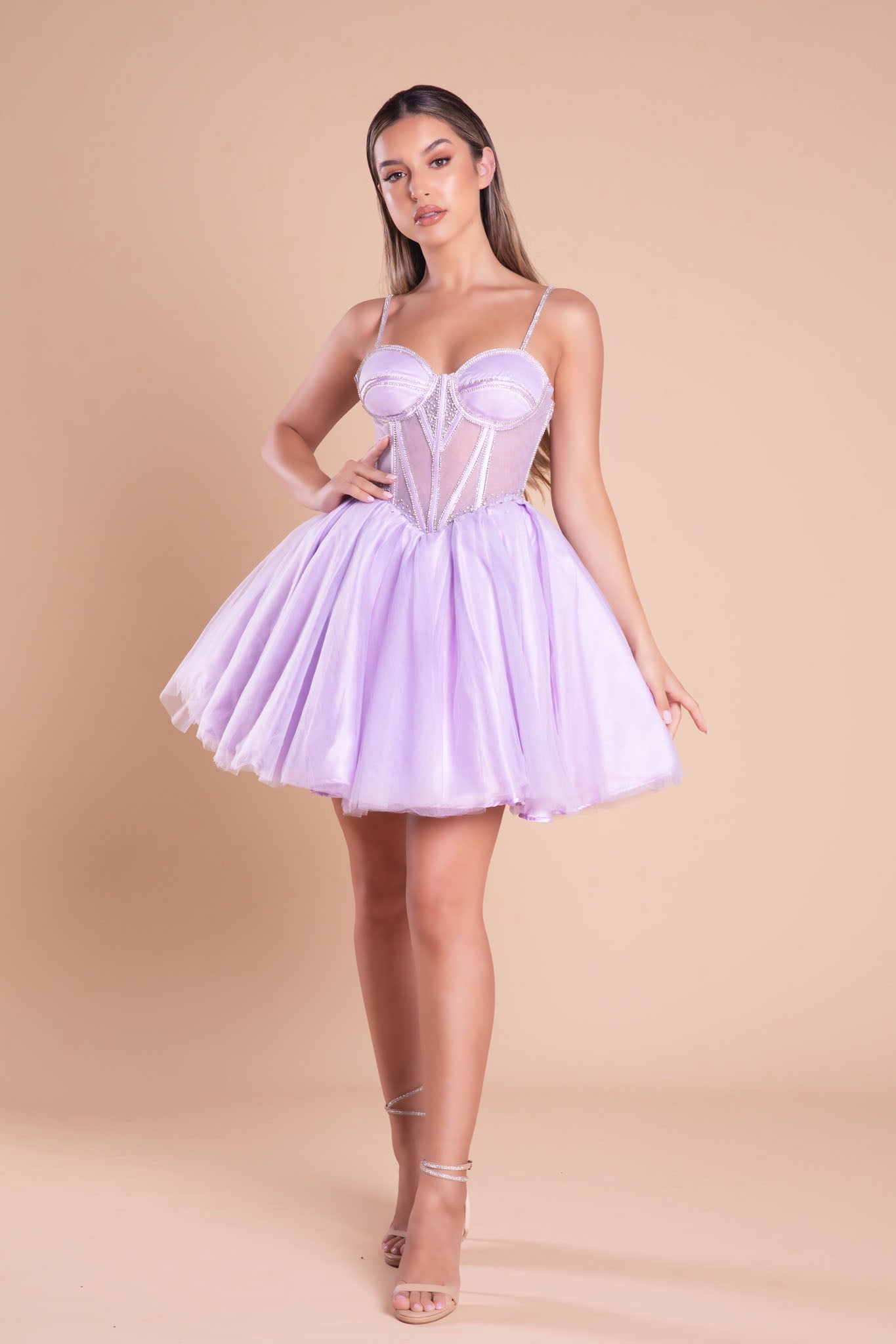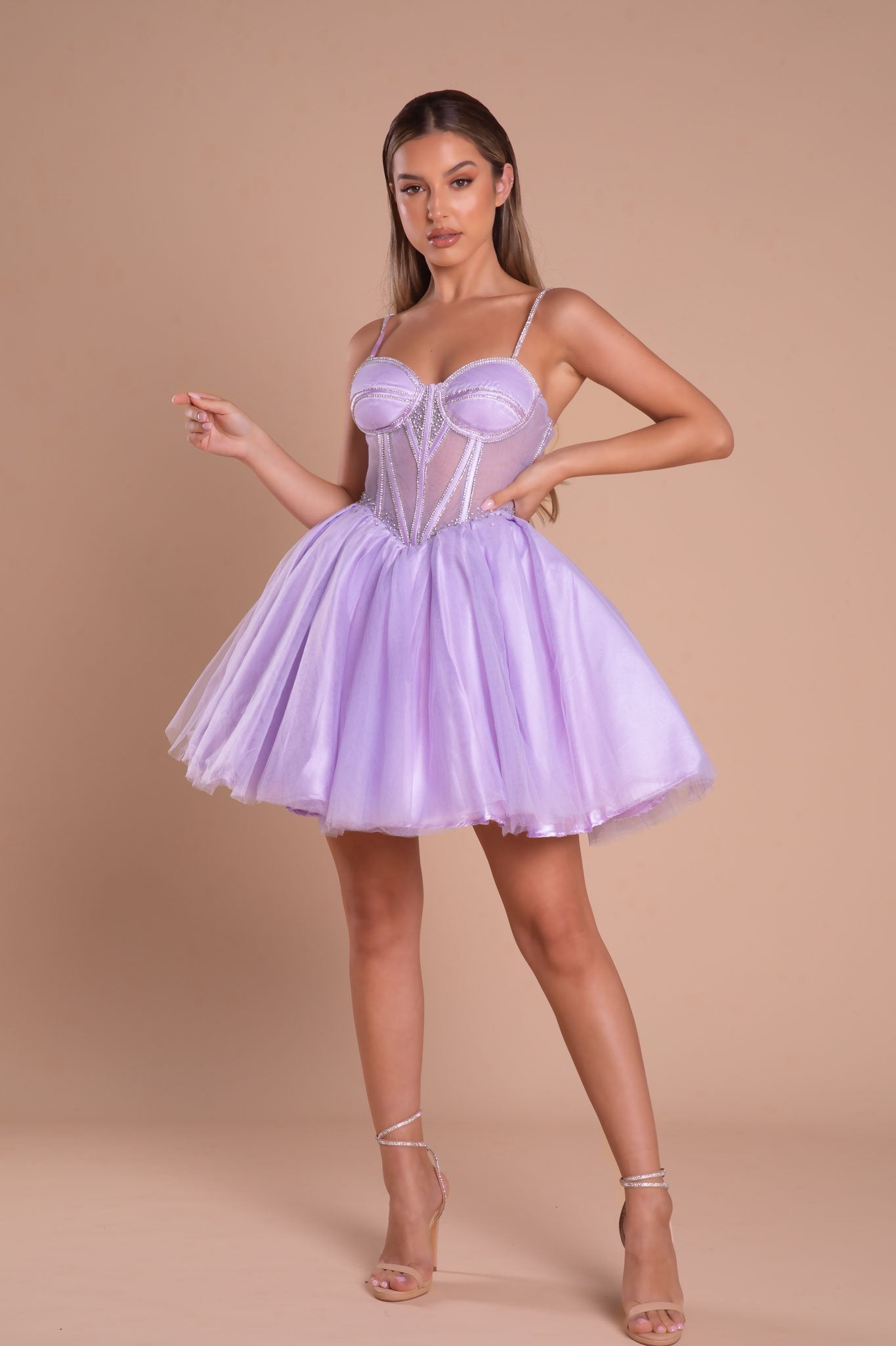 Portia and Scarlett PS21133 is Prom and Homecoming ready. This Tutu midi is a semi sheer corseted bodice with exposed boning detailed with crystal embellishments drawing the eyes attention to the tiny vee waist line. The midi has a medium flare. The dress is a standard size make with moderate stretch, the model wears size 2 and is 175cm tall wearing 1 cm high heels. Base fabric is Power mesh Body Con overlayed with netting and rhinestones with a centre back zip