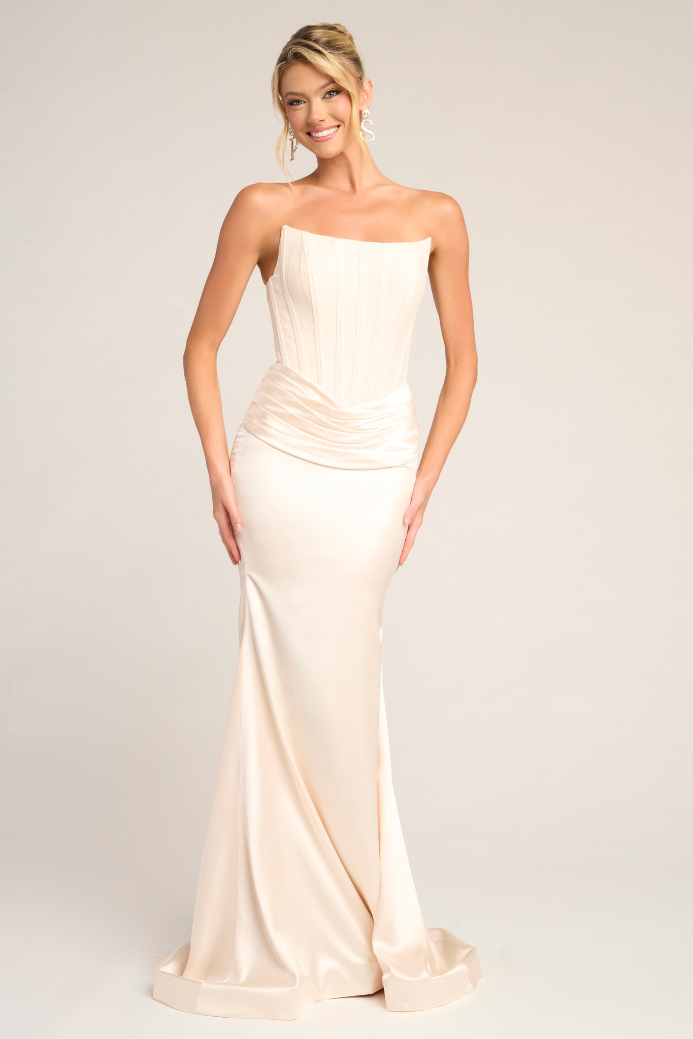 Style PS26032 embodies timeless sophistication with its minimalist design and impeccable tailoring. The strapless bodice features a structured, paneled construction that creates a refined architectural effect, subtly contouring the torso for a sculpted fit. Soft pleating at the waist transitions seamlessly into a smooth satin skirt that skims the body before flaring gently at the hem, creating an elegant hourglass silhouette.?