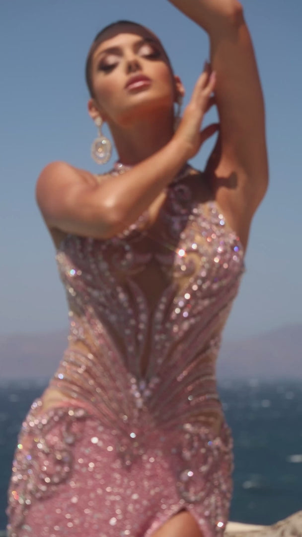 PS26436C is a vision of luxury and sophistication. The high illusion neckline and sheer bodice are adorned with intricate beadwork and embroidery that create a sculpted, corset-like effect. Flowing into a sleek fitted skirt with a daring thigh-high slit, the gown perfectly balances elegance and allure. Finished with a subtle shimmer and refined embellishments, this design captures timeless red-carpet glamour.