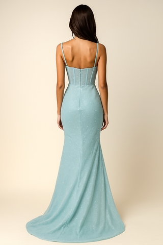 PS567 is a figure-enhancing gown crafted from stretch glitter fabric, offering a perfect blend of sparkle and sophistication. The corset-style bodice features structured boning and delicate straps for support, flowing into a ruched fitted skirt that flatters the silhouette. A thigh-high split adds a touch of allure, while the back showcases a smooth, form-fitting design that extends into a soft train. This dress is a stunning choice for prom, formal events, or evening occasions where elegance meets glamour.
