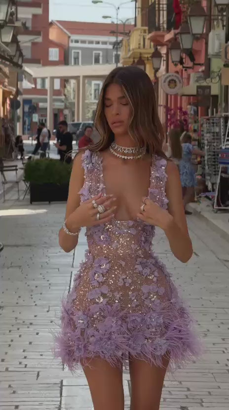 Turn heads in the Lilac Bloom Mini ??a dreamy, pastel-toned showstopper made for the spotlight. This playful mini dress features a deep plunging neckline, floral appliqu? details, and soft feather-like textures that add volume and movement. Its delicate lavender hues and 3D embellishments make it the perfect choice for parties, birthdays, or any event where you want to feel flirty and fabulous.