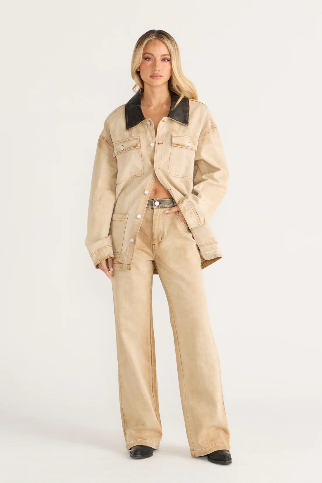 Cool, oversized, and effortlessly off-duty, The Steph Jacket brings major main character energy. Cut in a vintage-inspired sand-washed denim with contrast stitching and a worn-in look, its the kind of jacket you throw over anything and instantly look cooler. The structured silhouette meets slouchy fit, finished with utility-style patch pockets and a contrasting collar that gives a subtle edge. Wear it solo, layered, or paired with the matching wide-leg pants for a tonal moment were obsessed with.