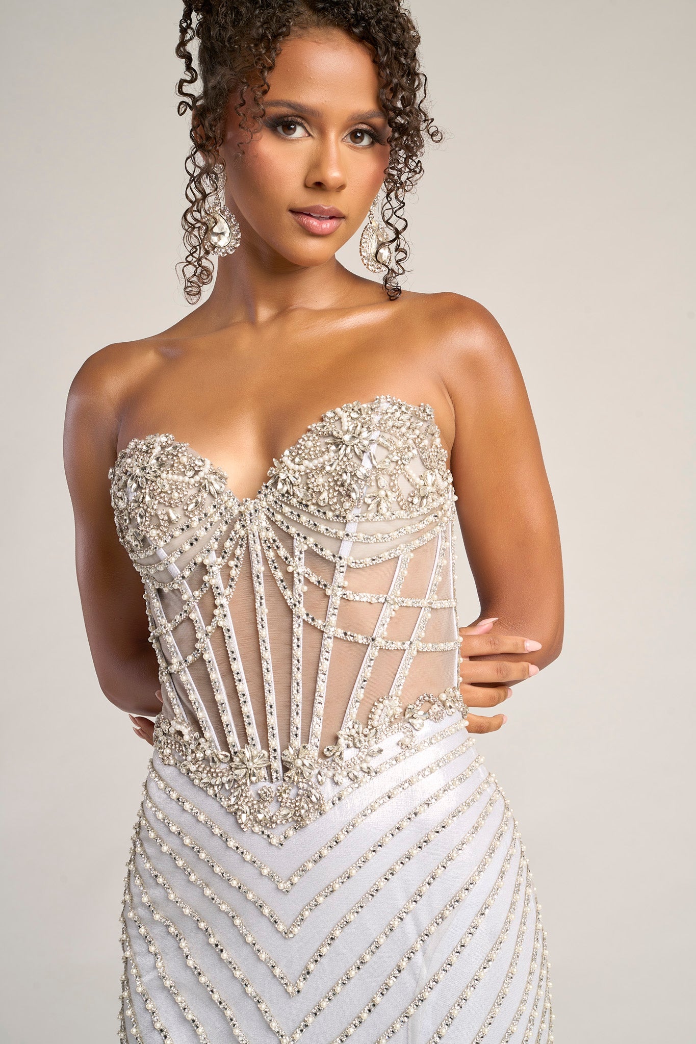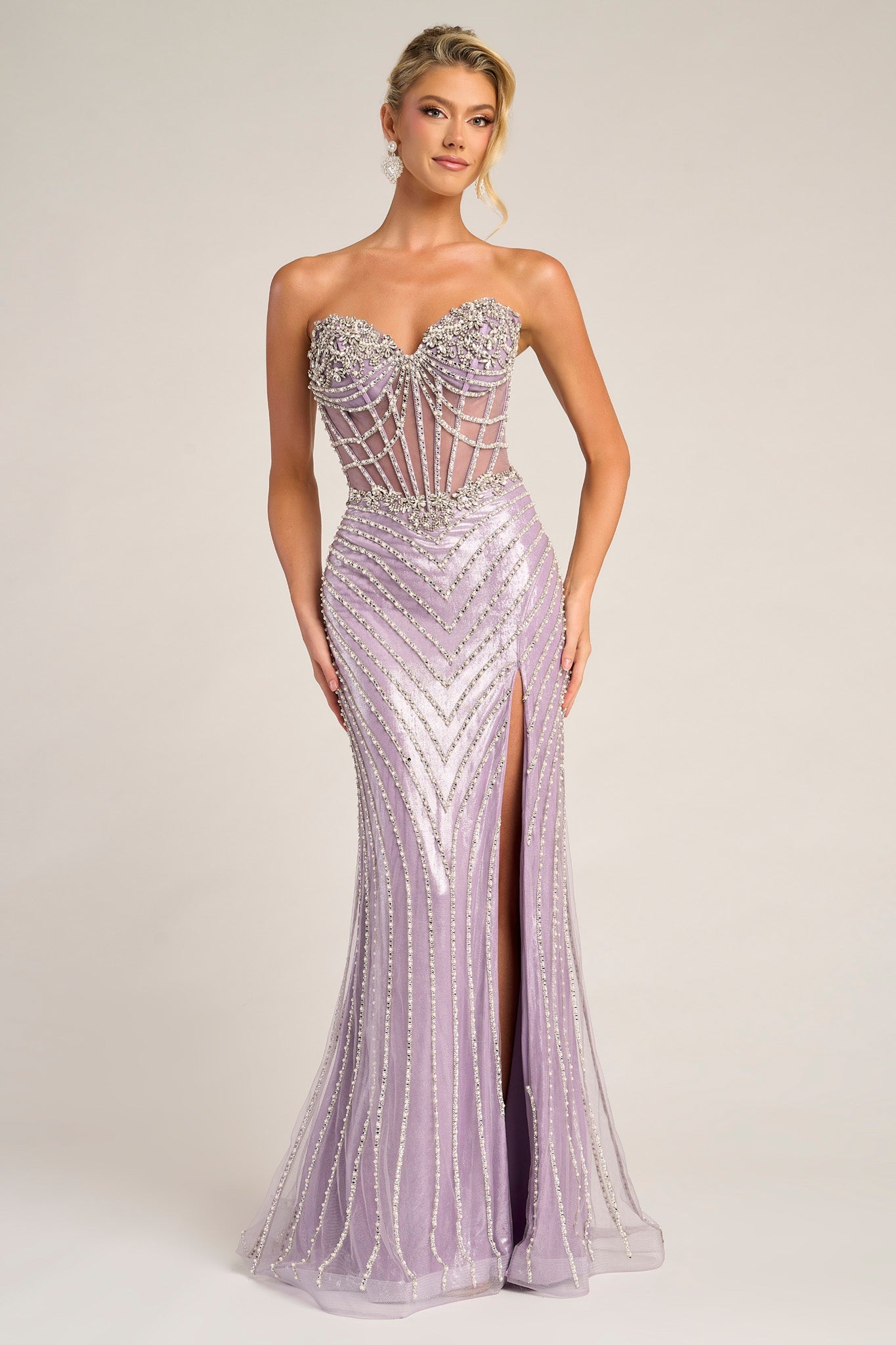 XO057 features a strapless sheer corset bodice with exposed boning and intricate bead detailing. The fitted skirt is designed with cascading linear embellishments that elongate the figure and lead into a thigh-high slit. Finished with a lace-up back, this gown offers a flawless balance of structure and sparkle.