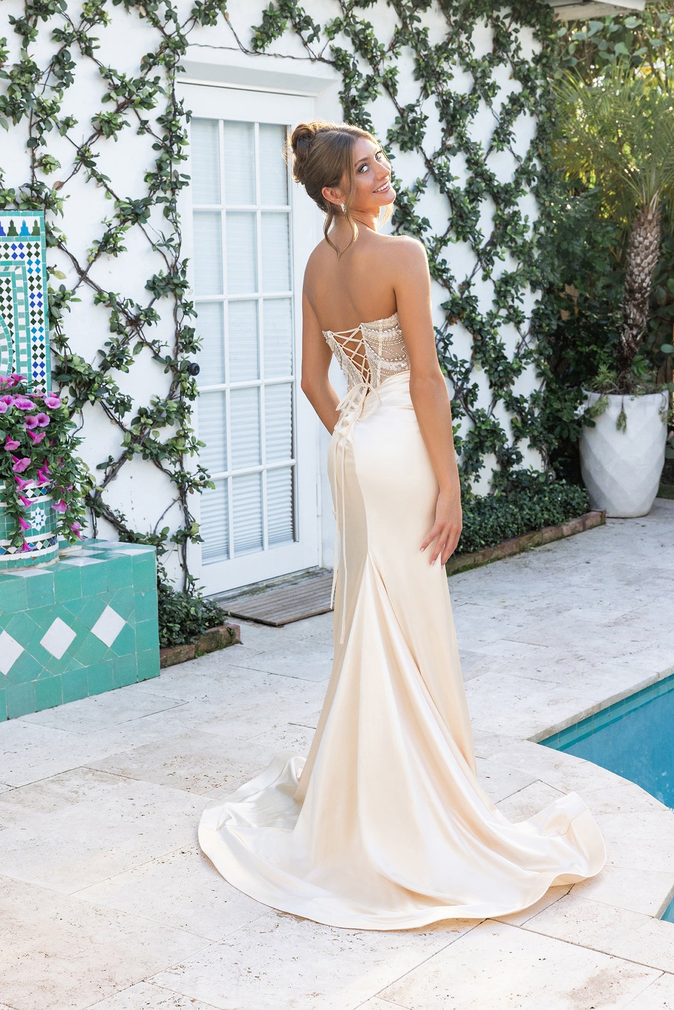XO065 features a fitted satin skirt paired with a structured corset bodice detailed in sparkling embellishments. Soft ruching at the waist adds definition, while a thigh-high slit and lace-up back complete the look. This gown blends classic glamour with a modern, flattering fit.